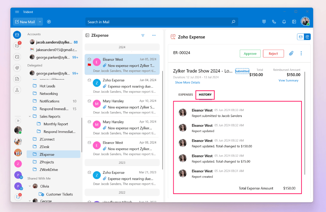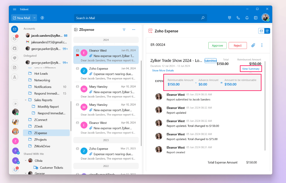 Once you have gone through the expense report, you can choose to either approve the expense or reject it. The action taken in Trident will automatically be reflected in the Zoho Expense web application.