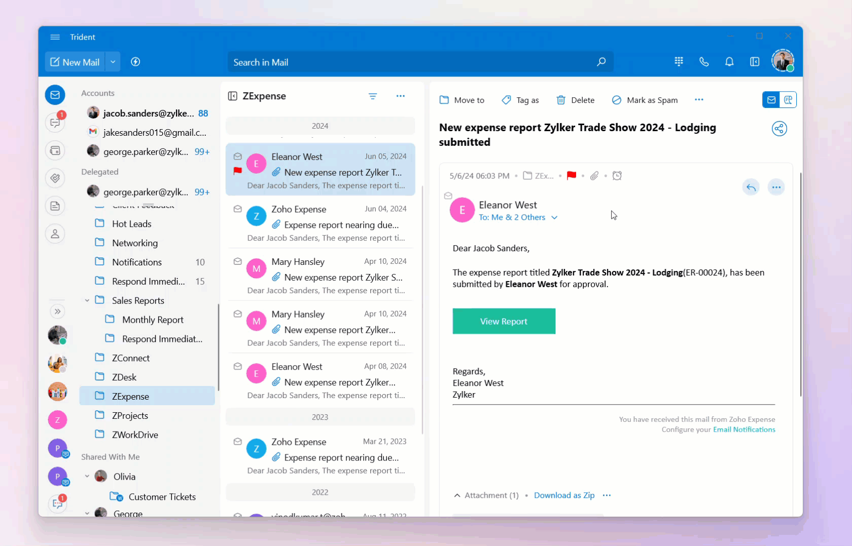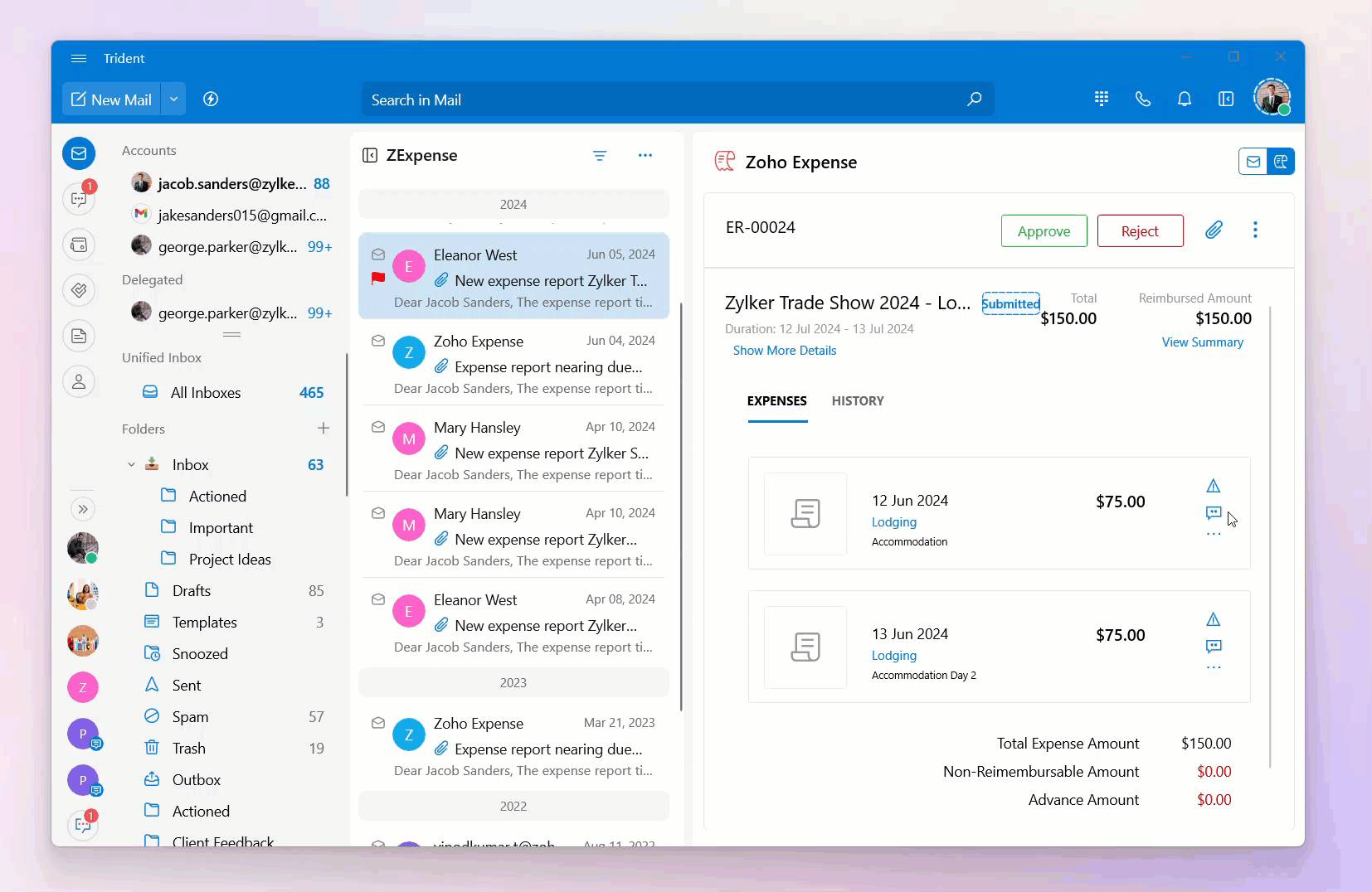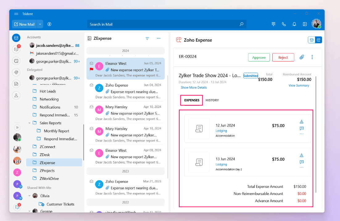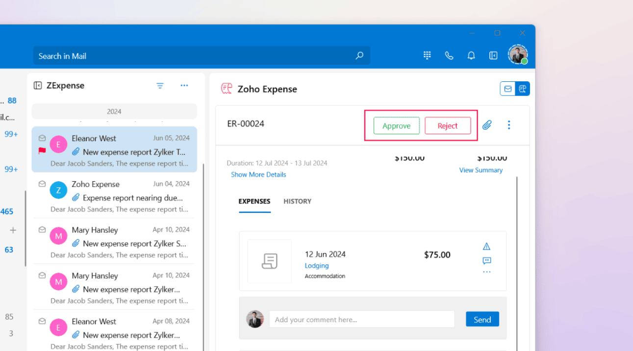 You can view expense details and perform actions like approving or rejecting expenses, reviewing attachments, adding comments, and more, all without leaving your mailbox.