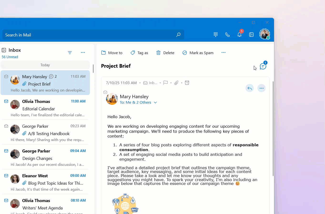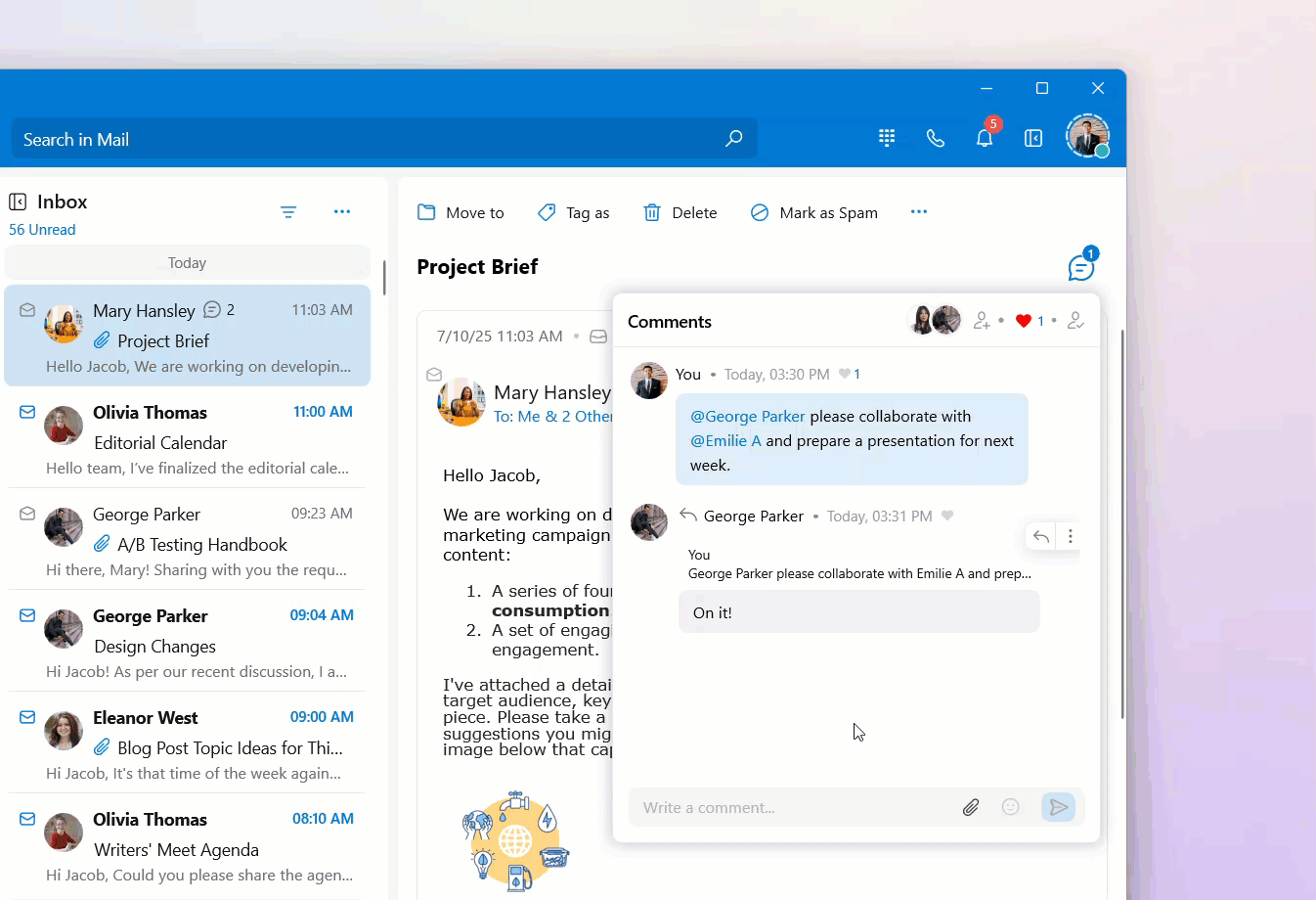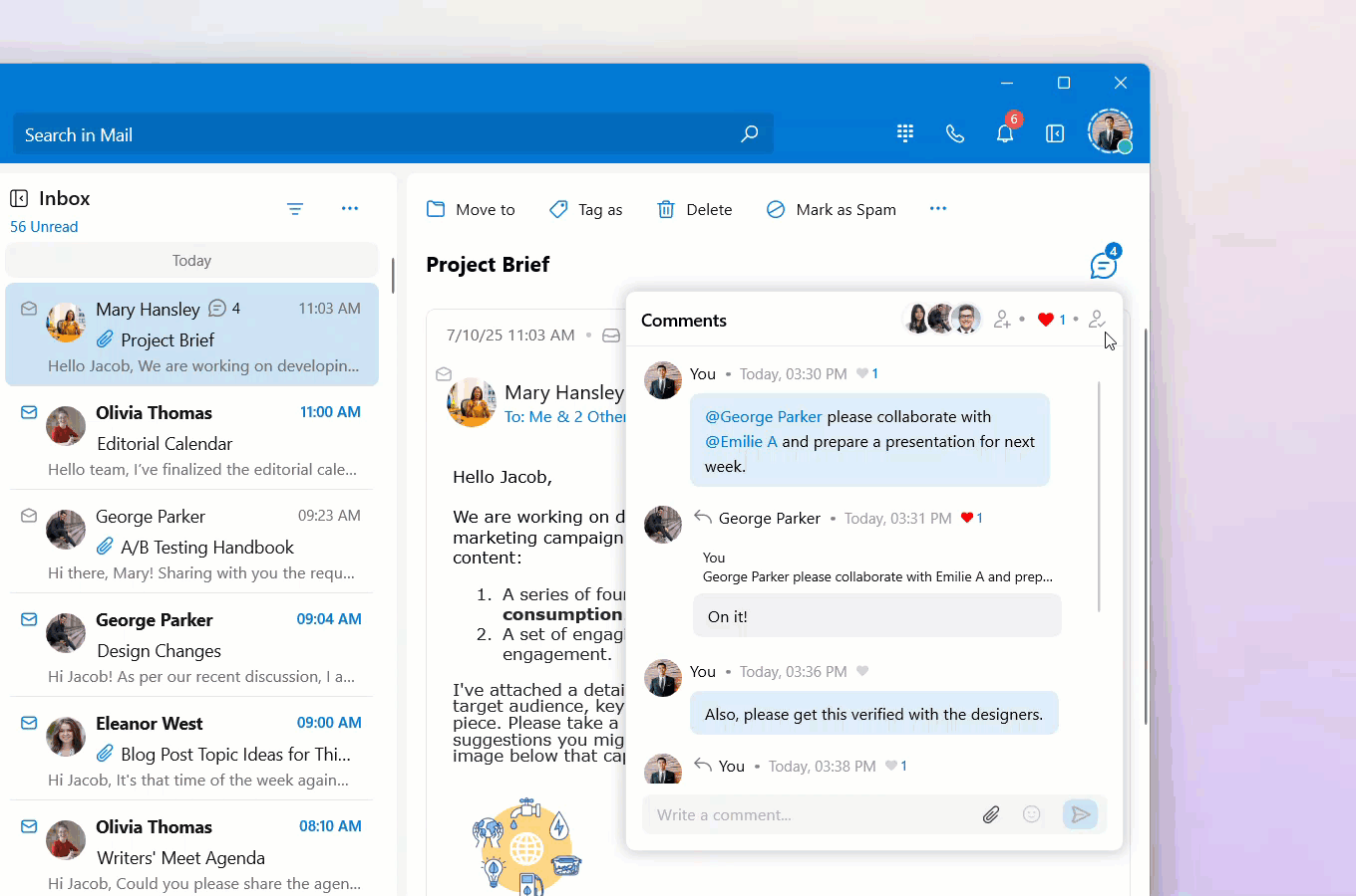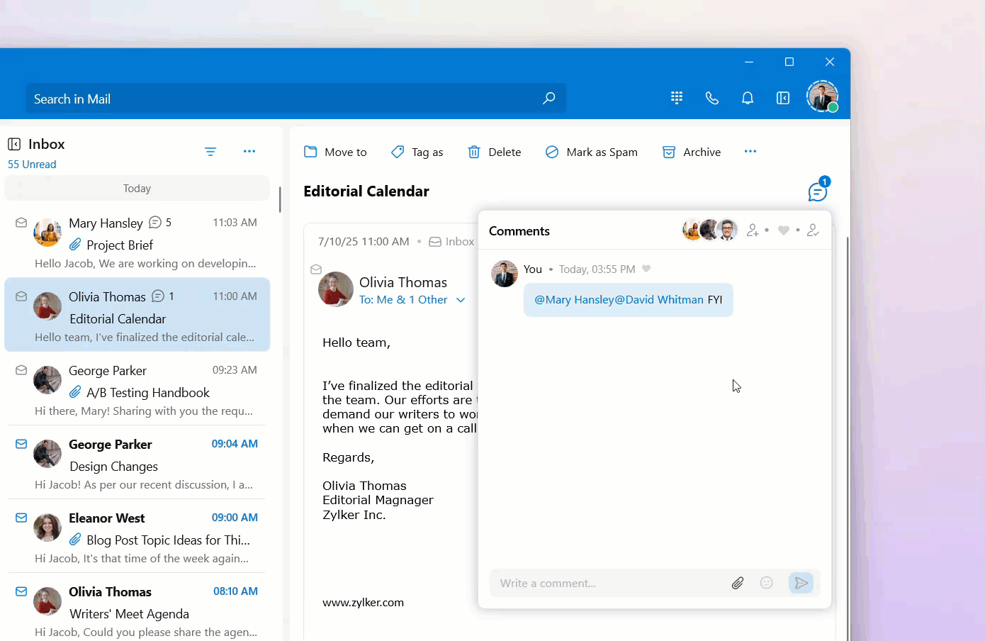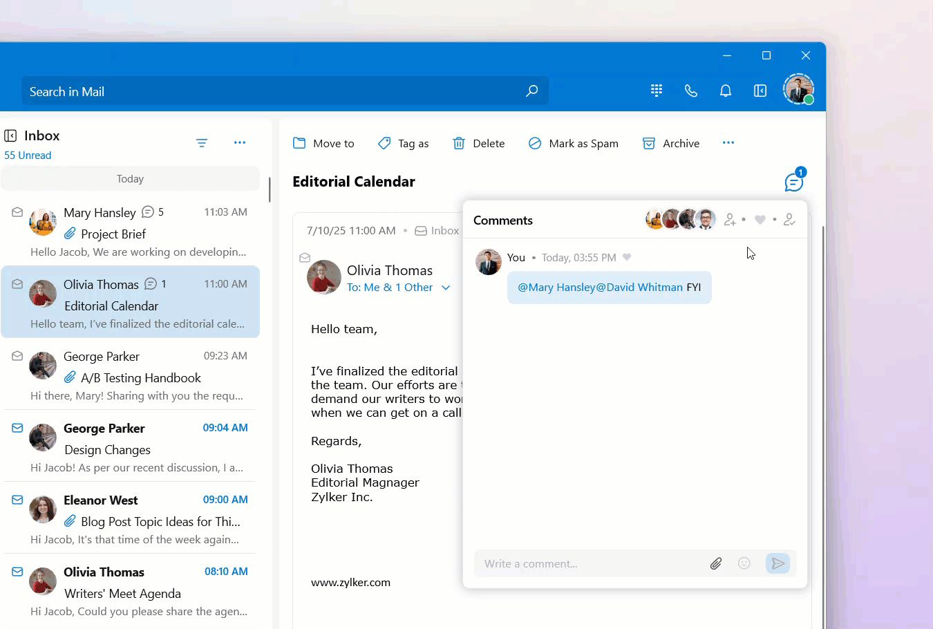 In the Mail module, you can enable the Streams Comments dialog as a popover or have it below the email detail view. When it's enabled as a popover, use the steps below to share an email with a colleague or a group: