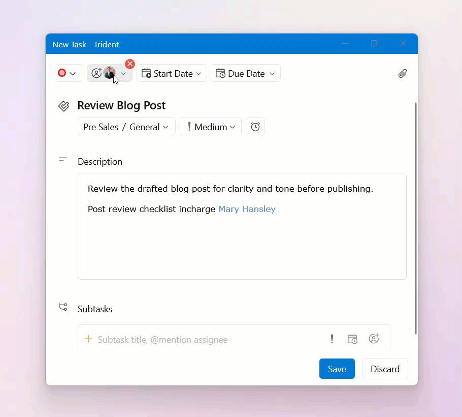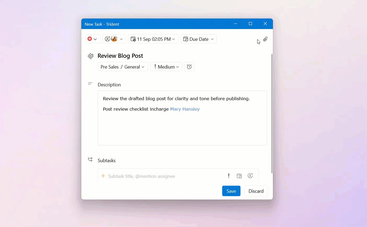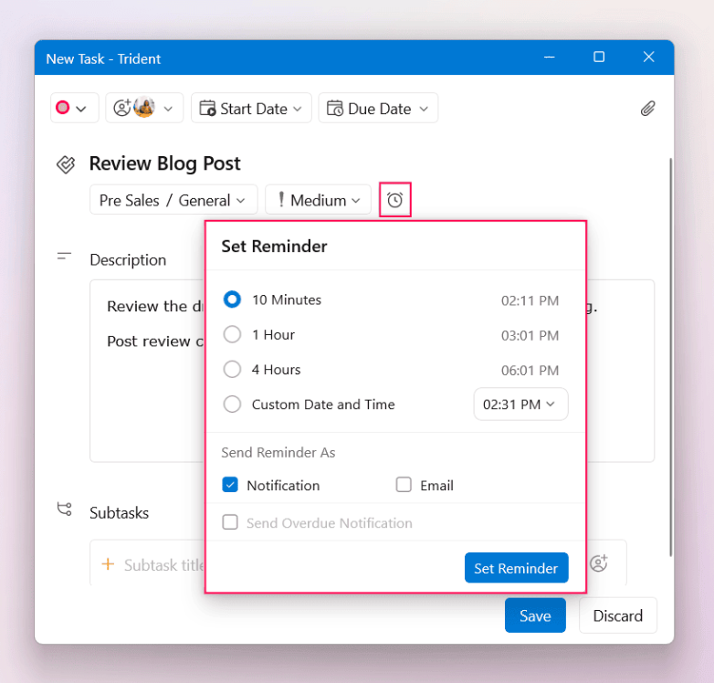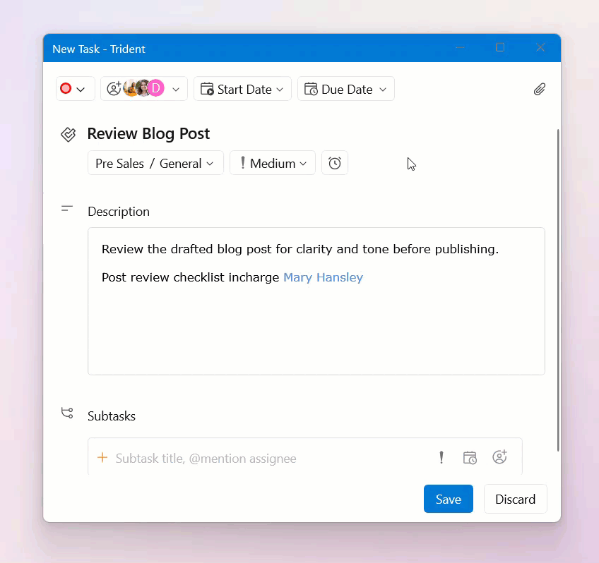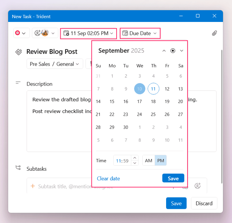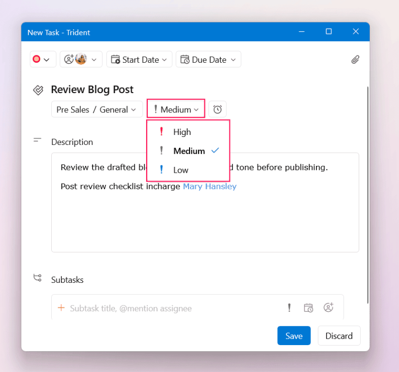 Set the priority, select the due date and time, and assign the task to your colleagues, if required.
