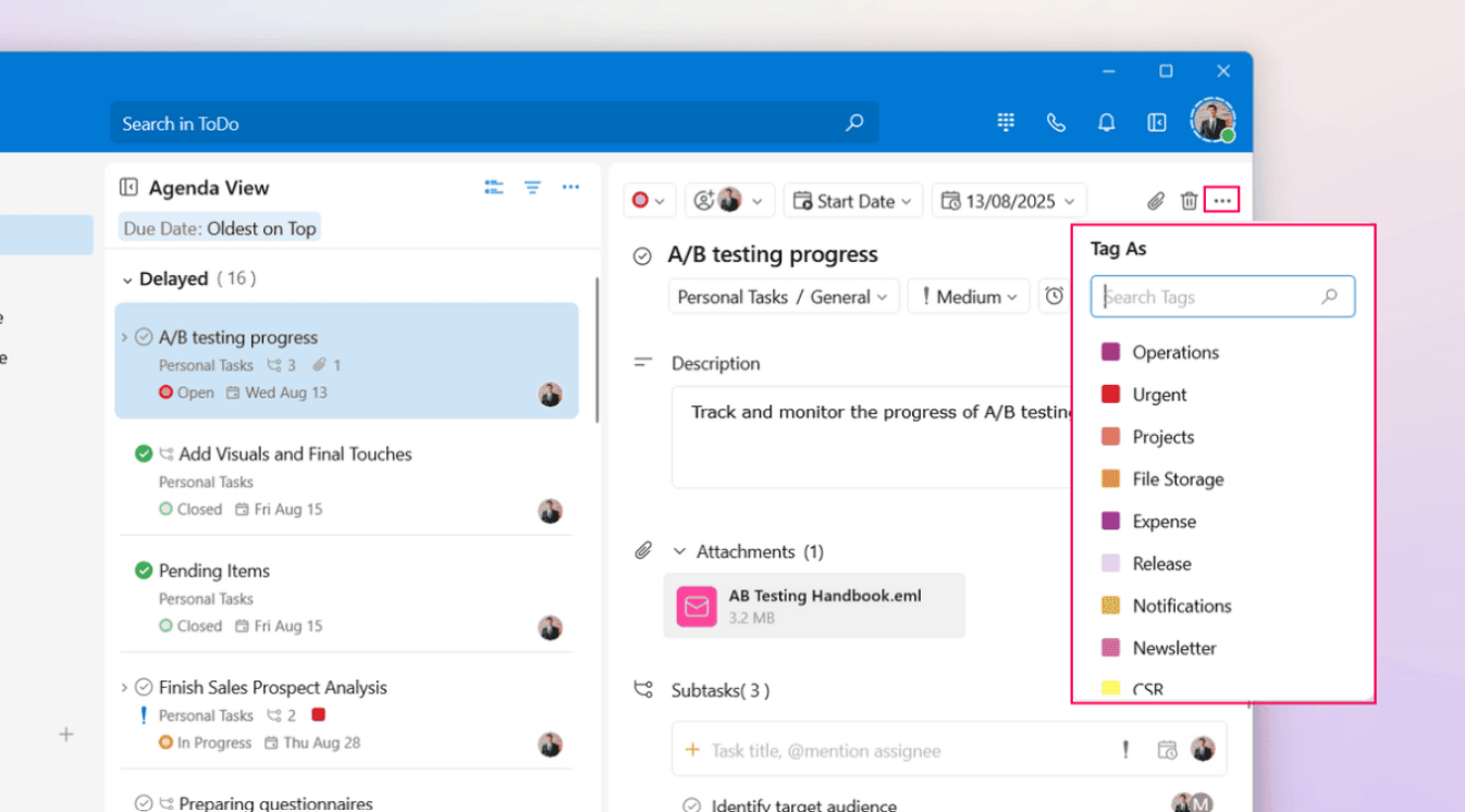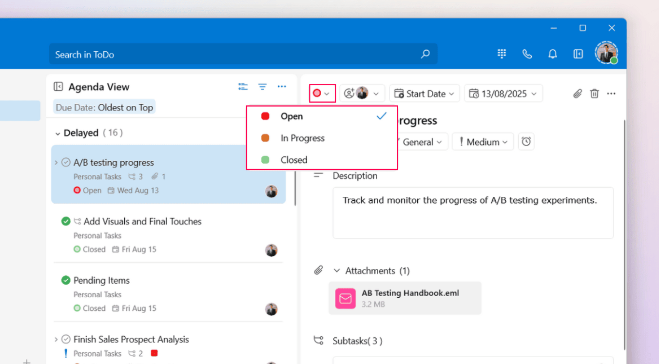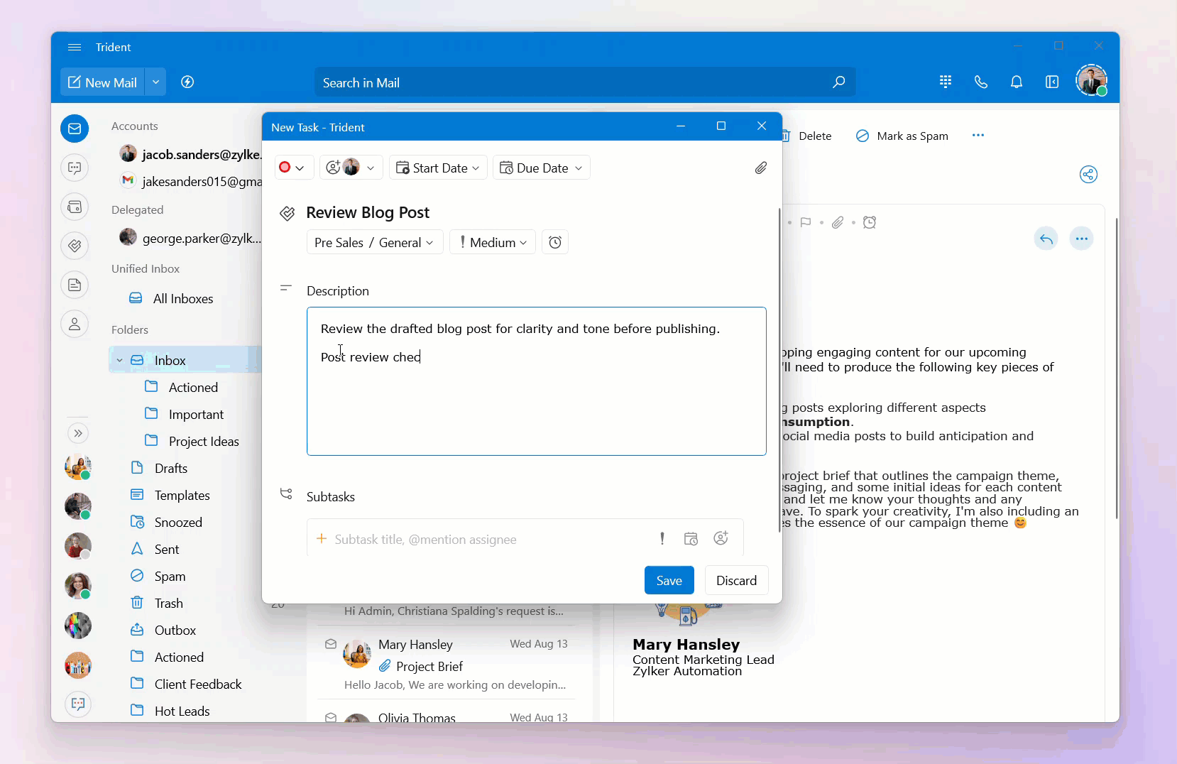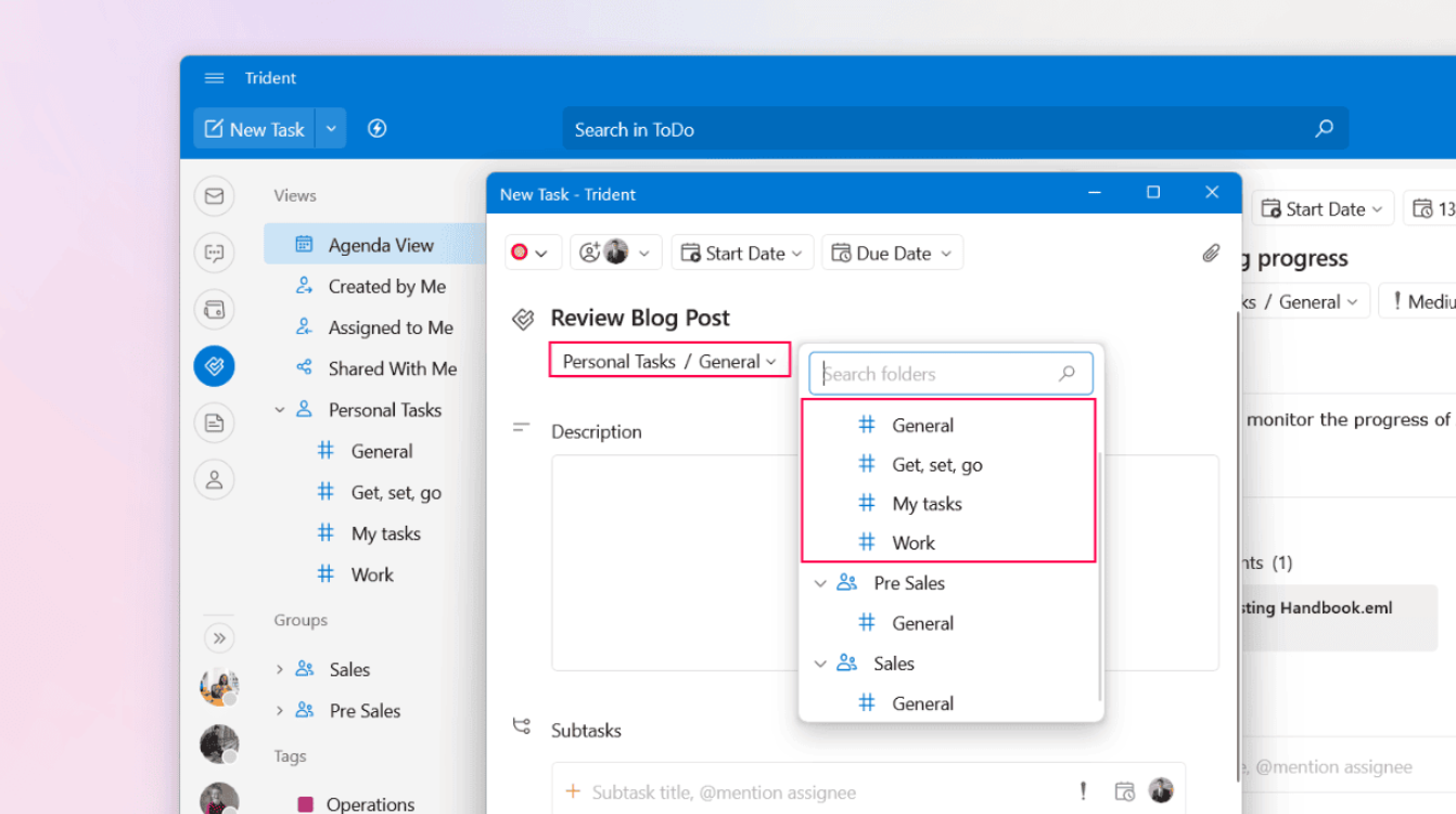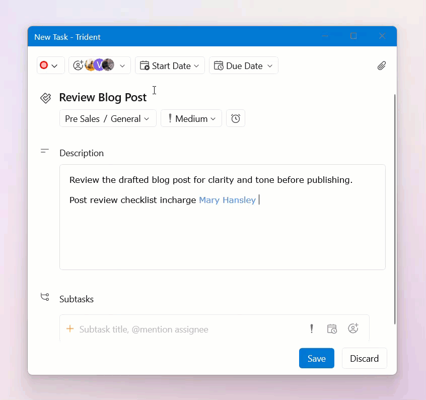 Set the priority, select the due date and time, and assign the task to your colleagues, if required.