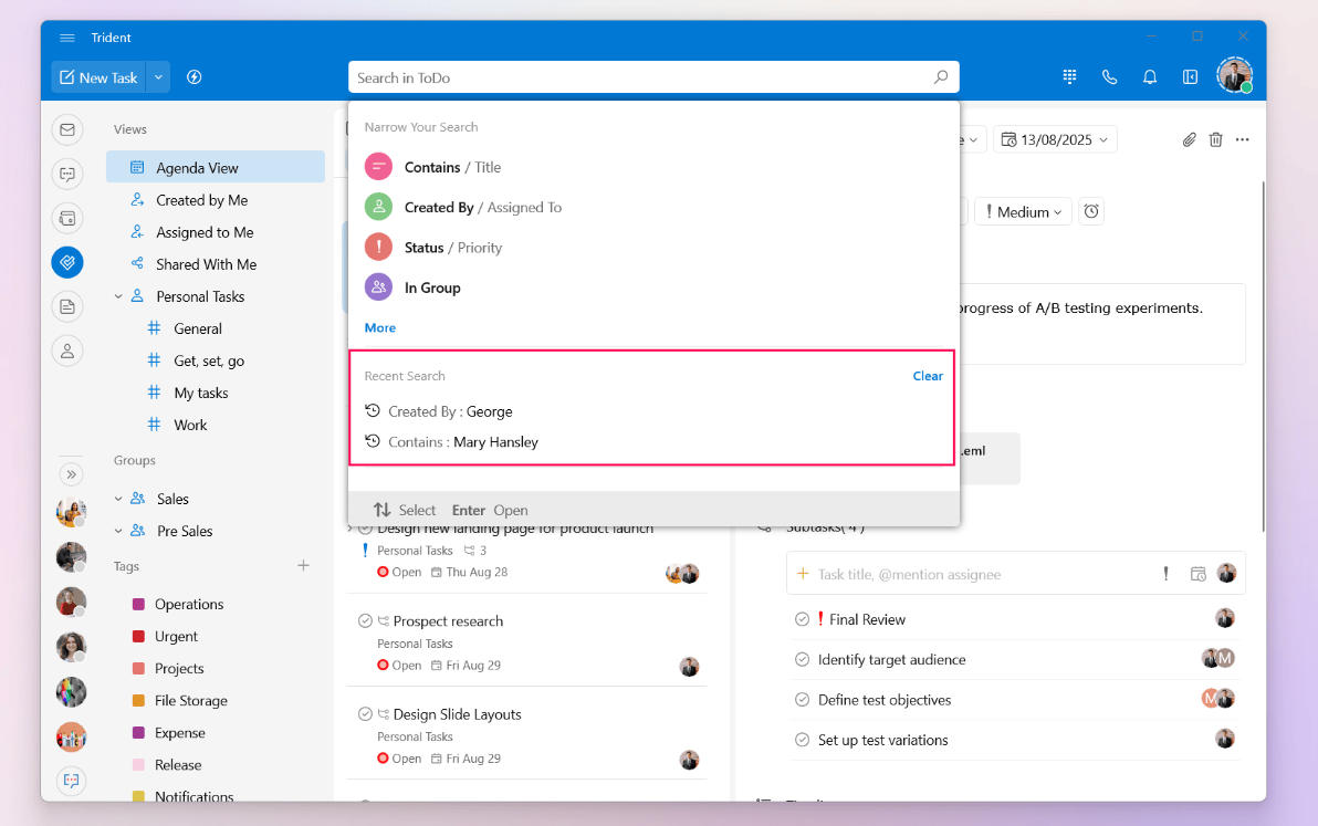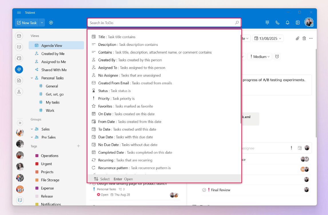 Search in Tasks offers more than 20 distinct search parameters. Each parameter and its function is described below.