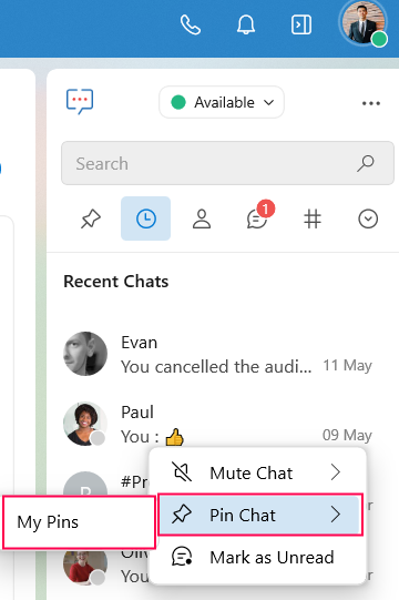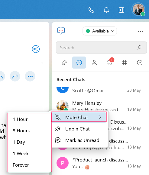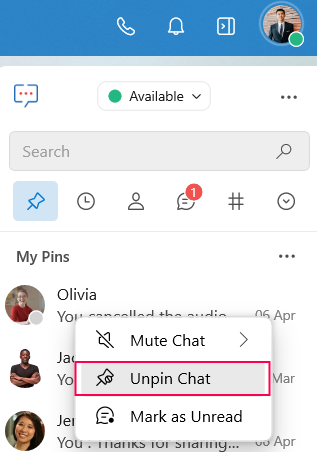 From the chat list, you can pin, mute, and mark chats as read or unread using right-click actions.