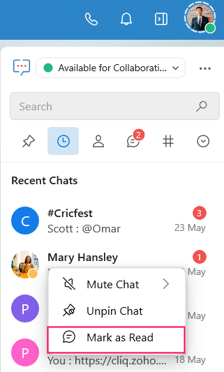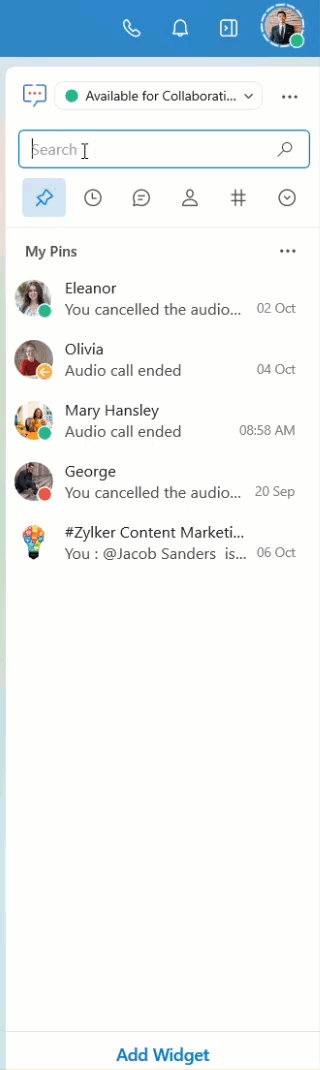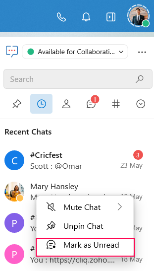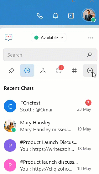 Threads | Lists the threaded conversations as separate chats from various channels. Note: This view is available only when the Cliq preference is set to In a Separate Threads Tab. | |