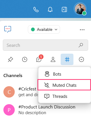 Select Muted Chats from the drop-down menu. Alternatively, search for the chat you want to unmute and right-click it.