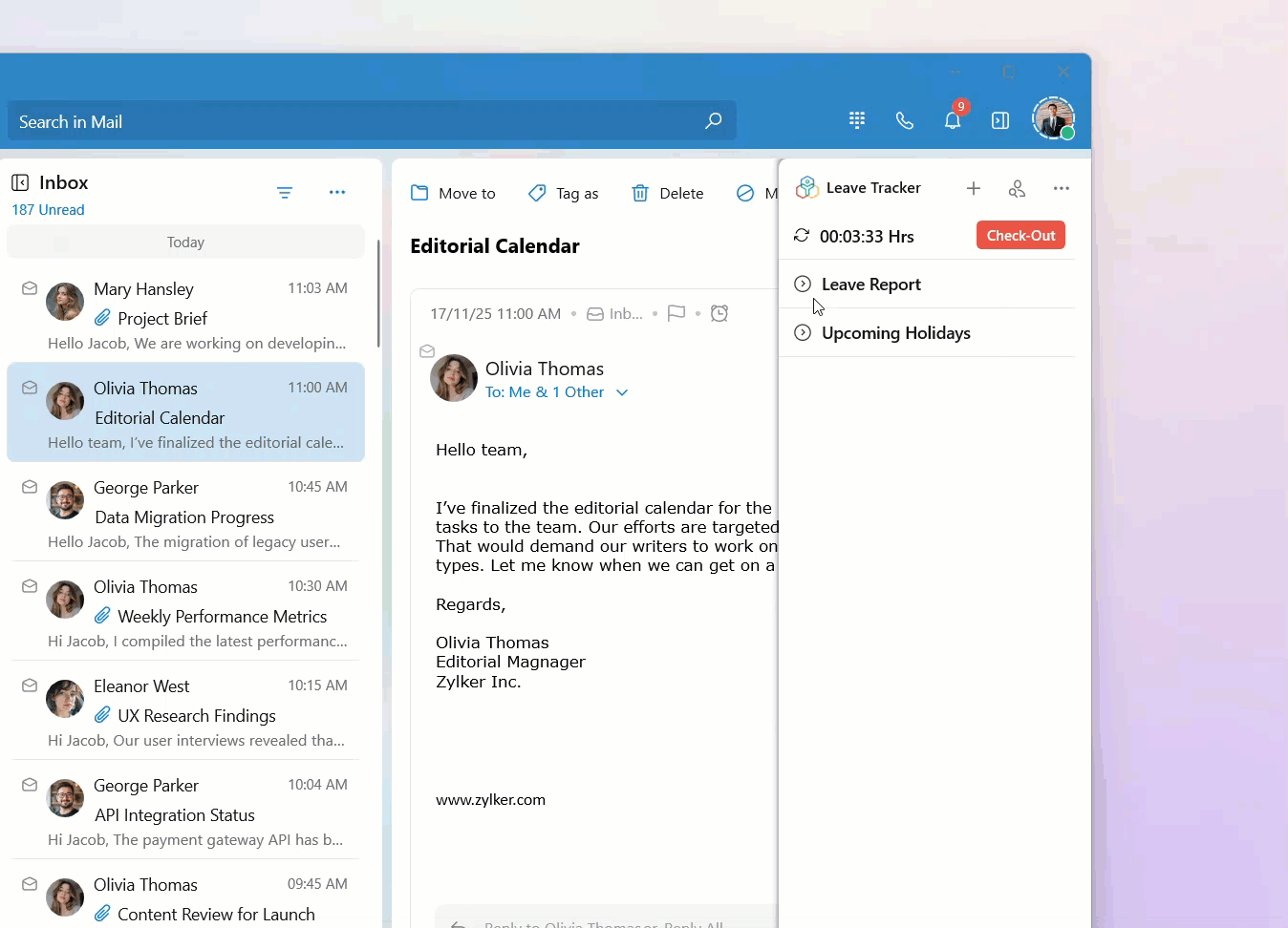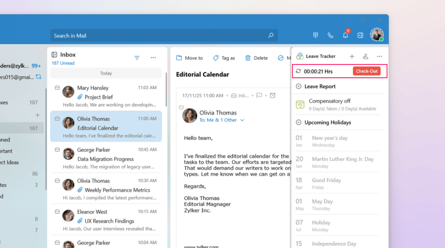 The Leave Report gives you an overview of the days you were absent and your available leave. To view them, click open the Leave Report drop-down. For that annual year, per your company's leave policy, you'll find the list of the types of leave, such as Casual Leave, Sick Leave, Optional Holiday, and others. This list will show you the amount of leave you've taken and the available leave under each leave type.