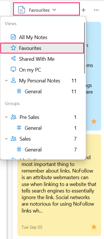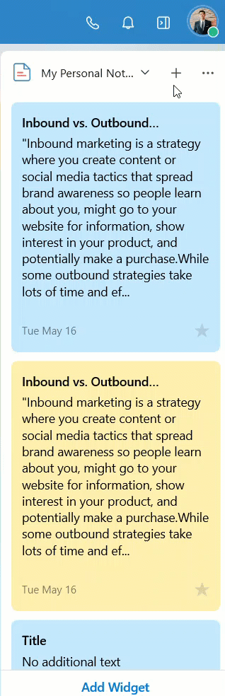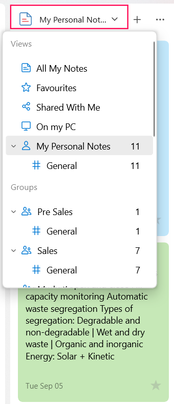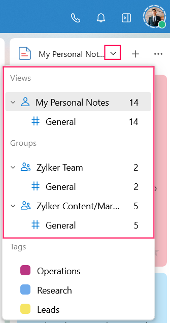 You can organize your notes into distinct views, groups, and tags. By default, the Notes widget lists notes under the "My Notes" category. To access the notes under other categories: