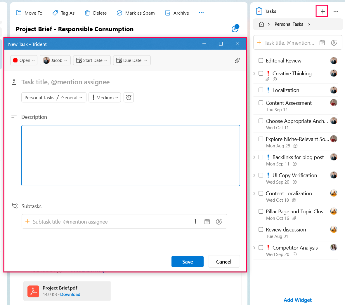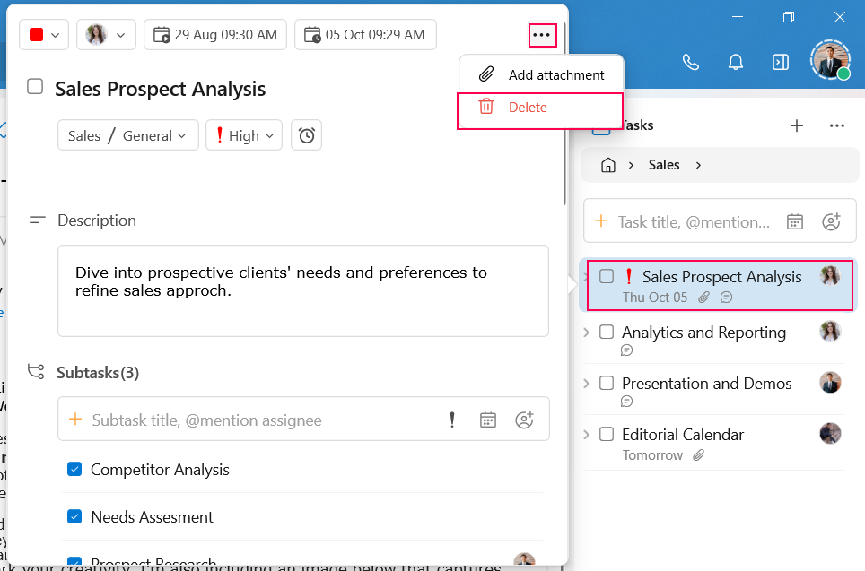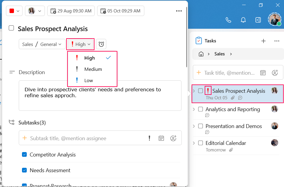 Optionally, you can set the task status, priority, and start and due dates, add descriptions and attachments, and add subtasks.