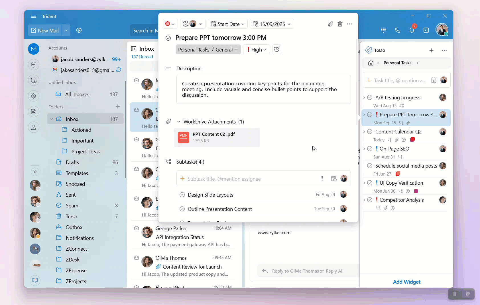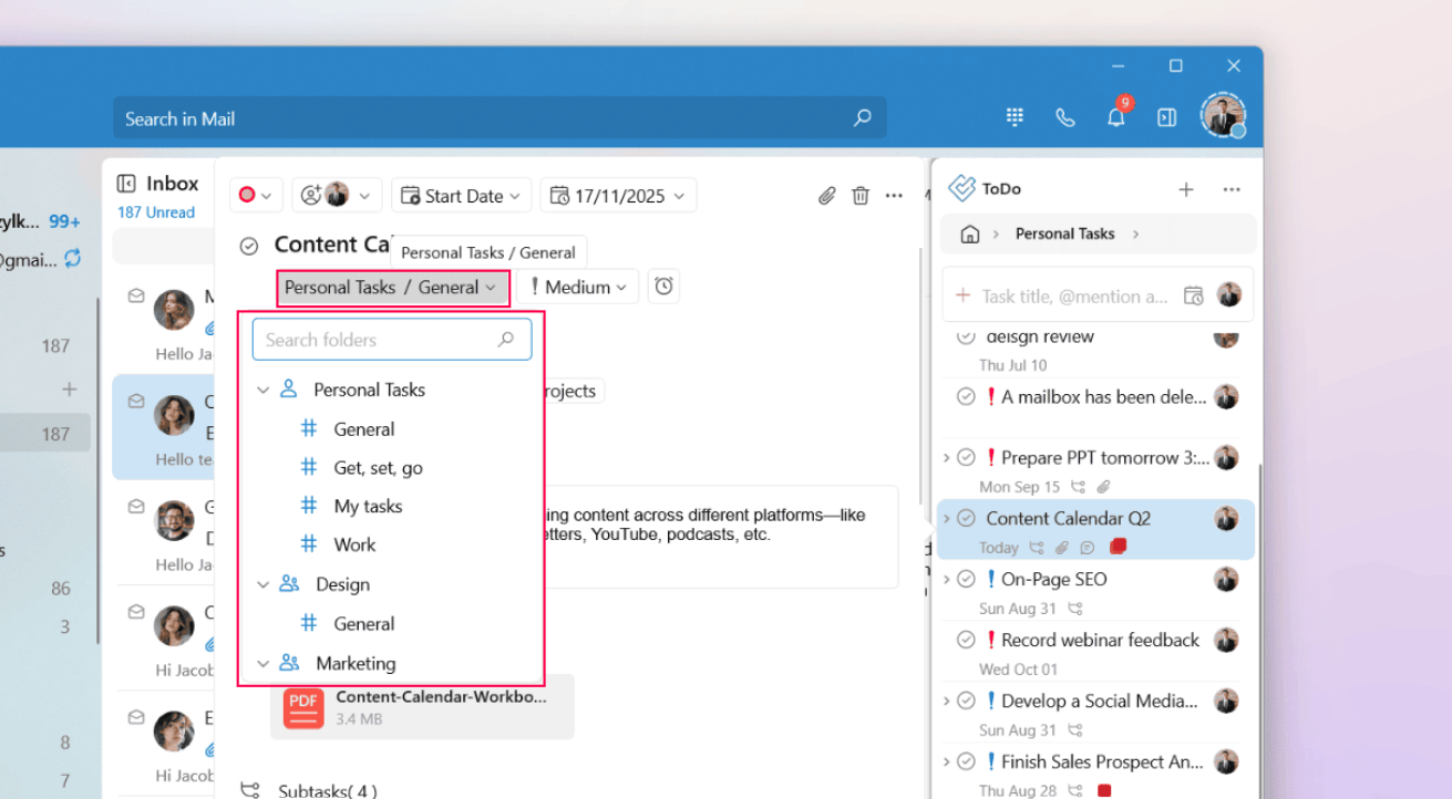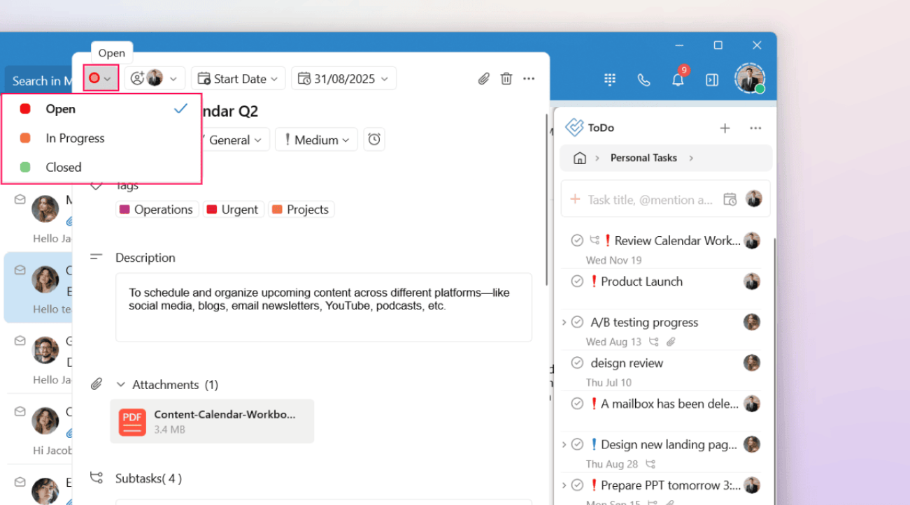 Optionally, you can set the task status, priority, and start and due dates, add descriptions and attachments, and add subtasks.