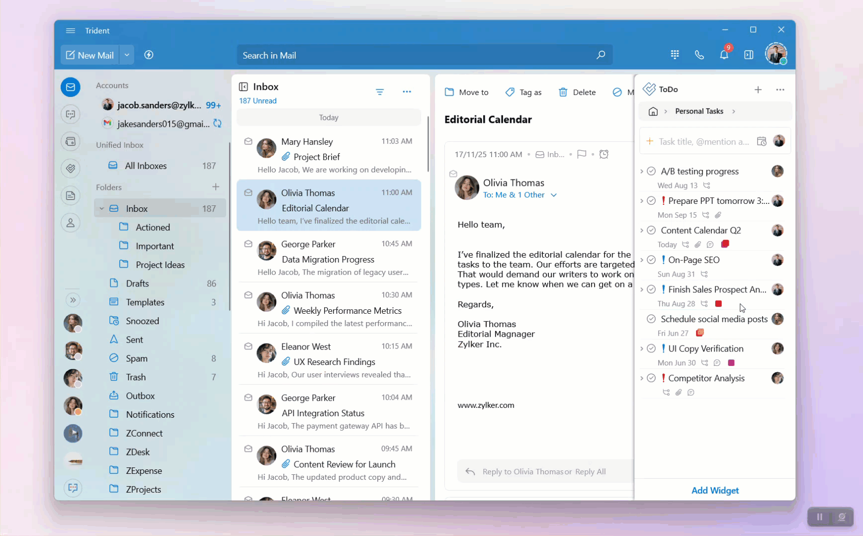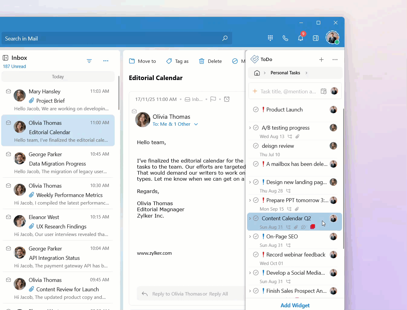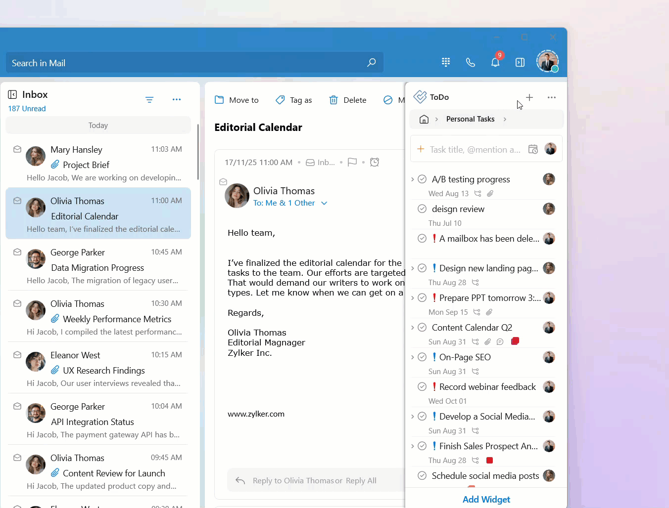 Your tasks are categorized into personal tasks, group tasks, and tags. You can access the tasks listed in these categories by clicking on the respective category on the ToDo widget home page.