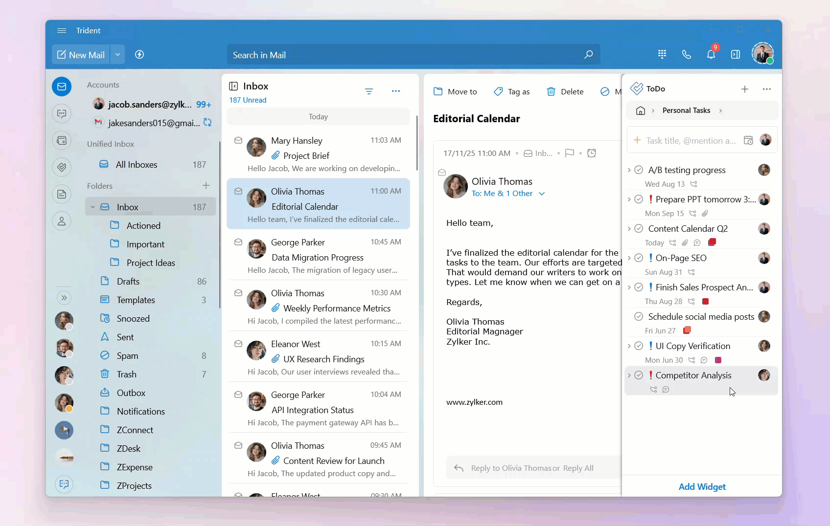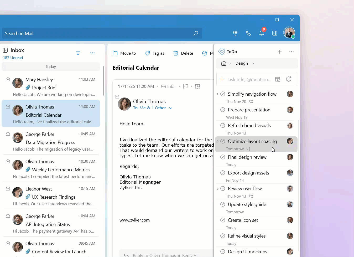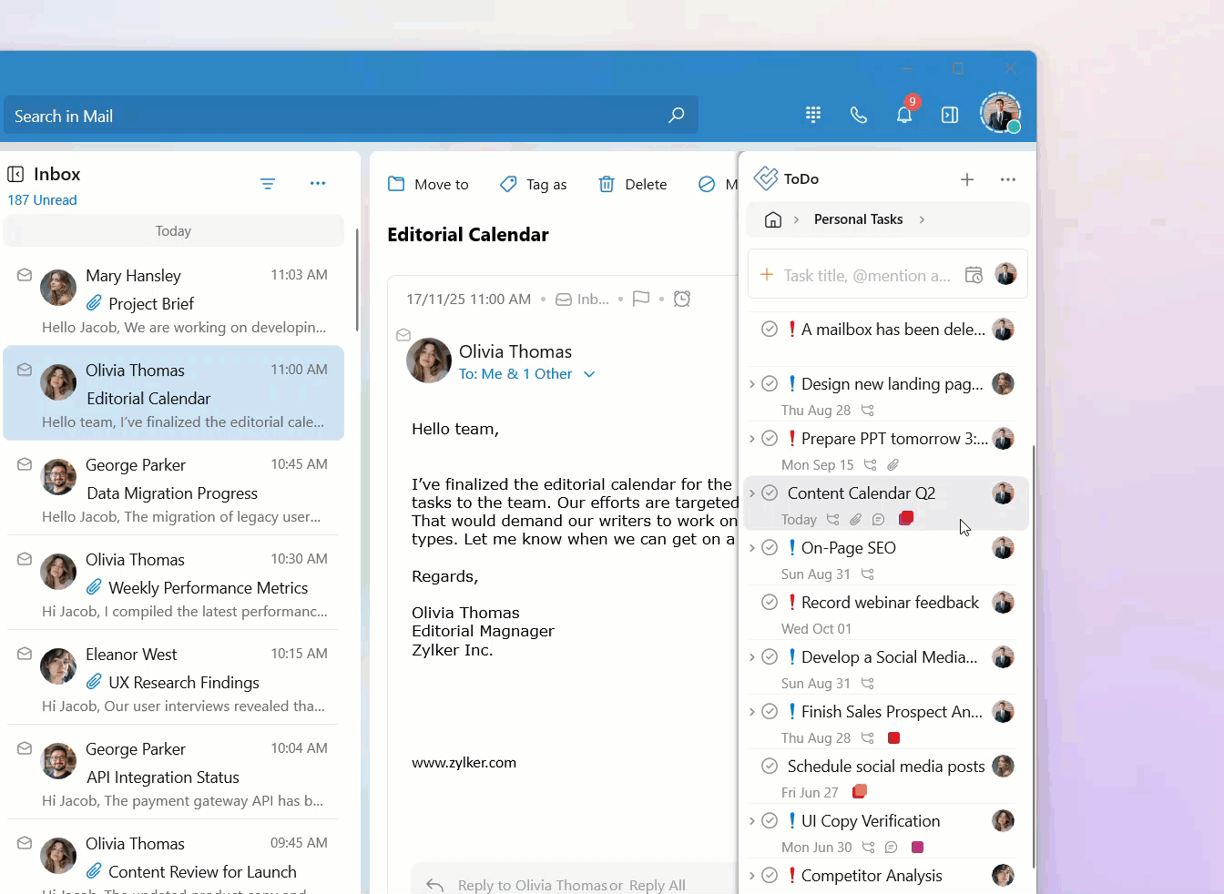 Your tasks are categorized into personal tasks, group tasks, and tags. You can access the tasks listed in these categories by clicking on the respective category on the ToDo widget home page.