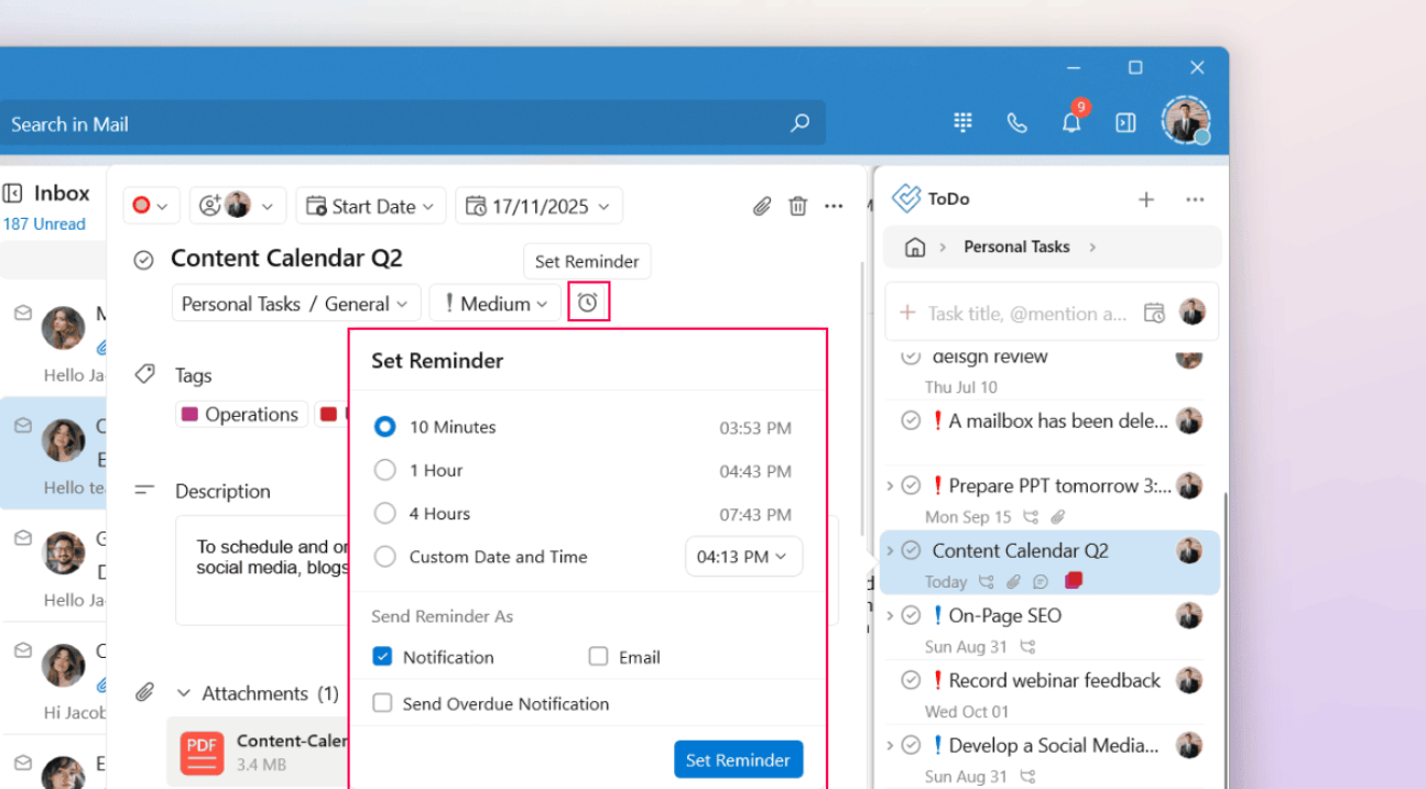 Choose to receive the reminder either via Notification or Email.