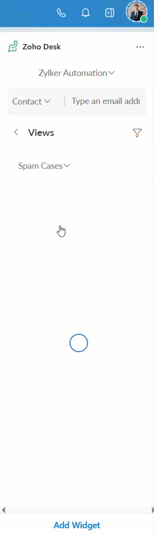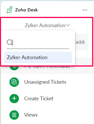 Views: Enables you to view the list of all the tickets from the selected department. It is set to All Cases by default. If you have created custom View filters in the Zoho Desk web app, you can select them from the drop-down menu to list the tickets from that specific view.