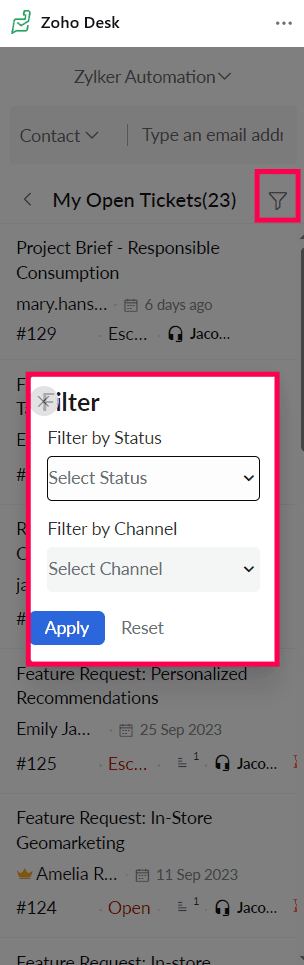 Unassigned Tickets: Displays all of the unassigned tickets and lets you filter them according to the predefined set of Status or Channel parameters you've set in the Zoho Desk web app.