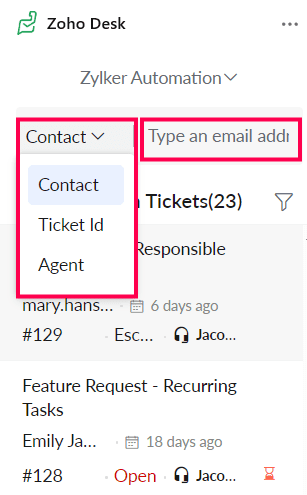 Use the search filters such as Contact, Ticket ID, and Agent to narrow down your search.