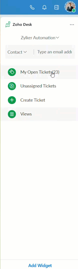 The Zoho Desk eWidget's home page has the following functions: