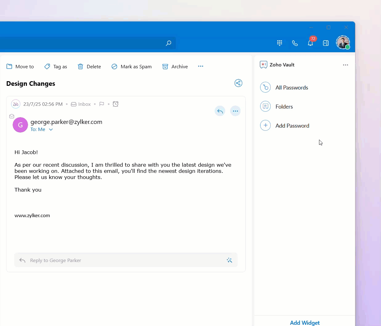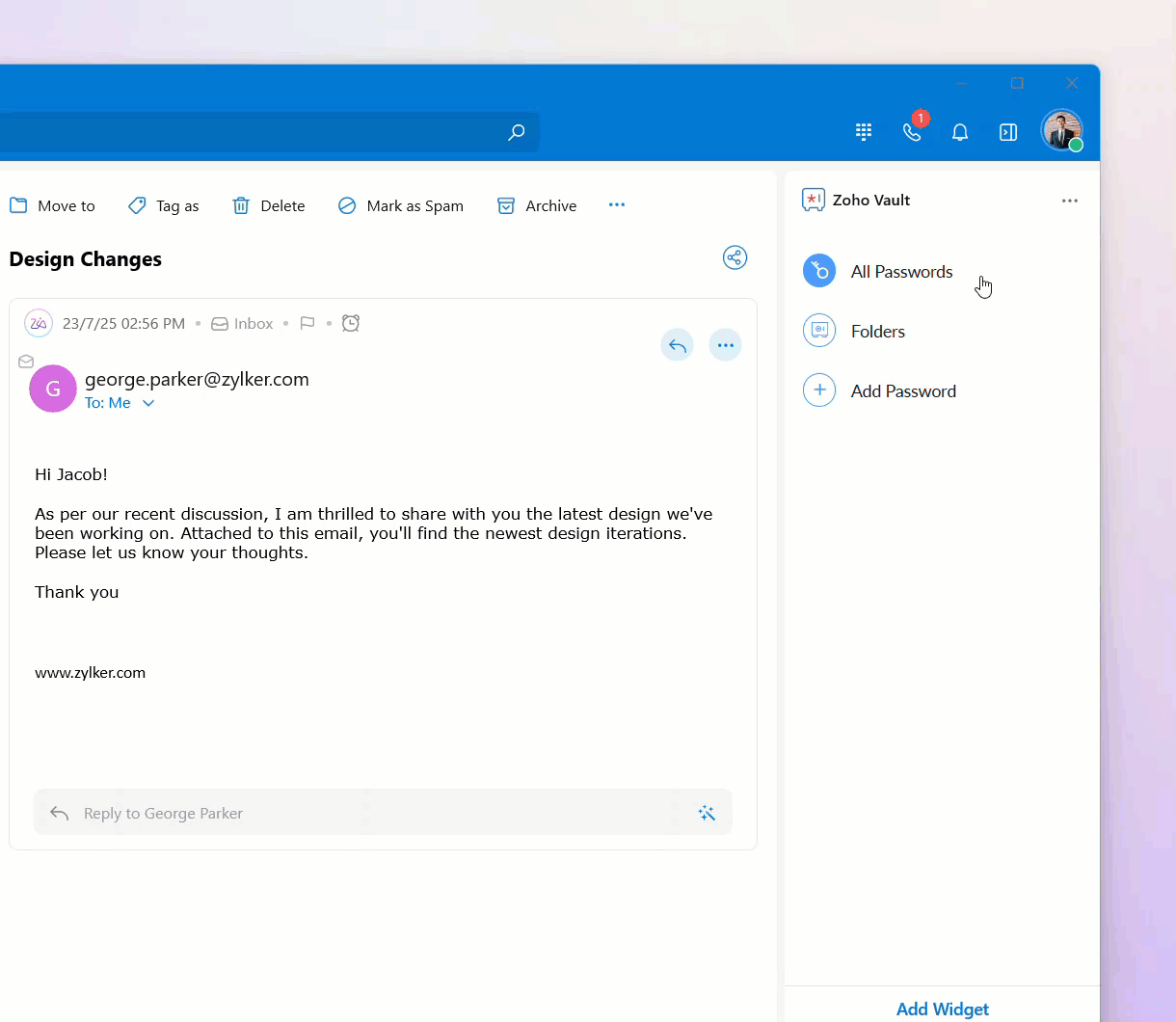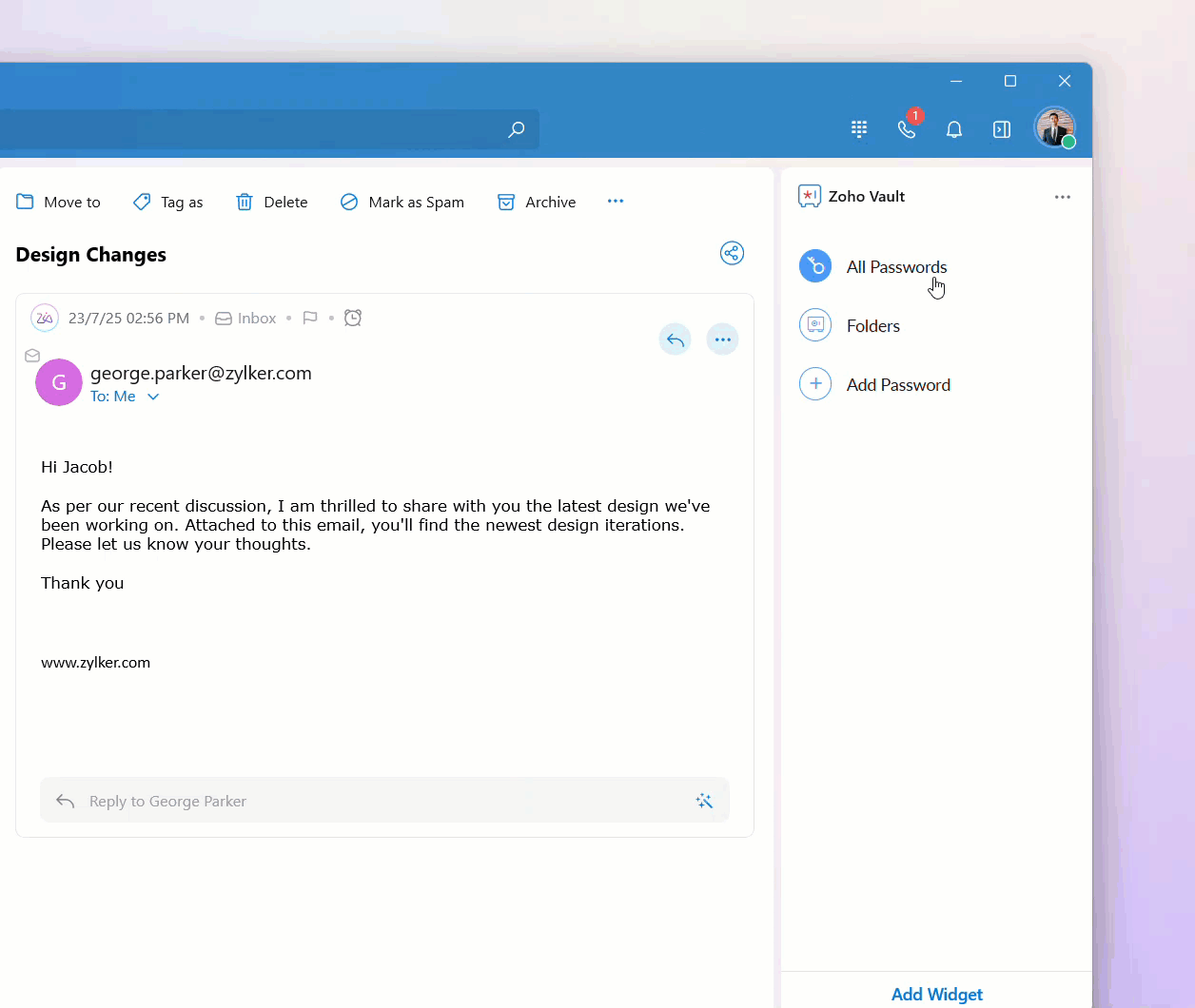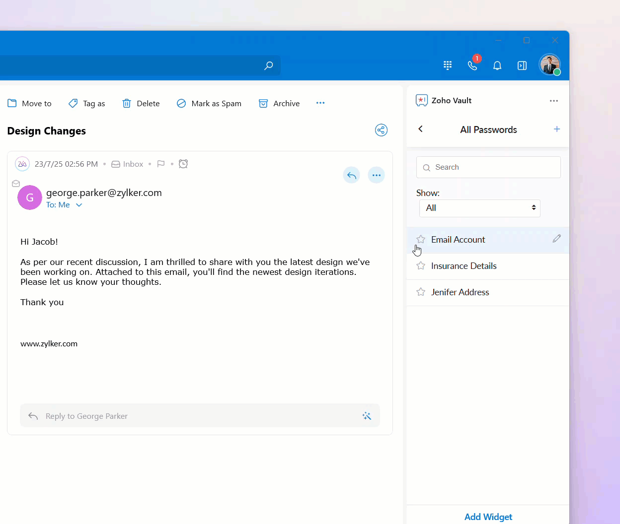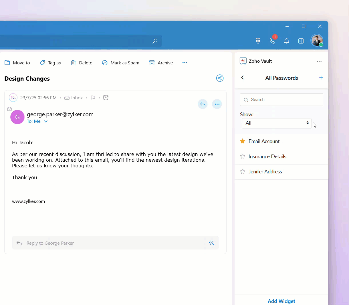 Add the Zoho Vault widget by clicking the + icon next to it.