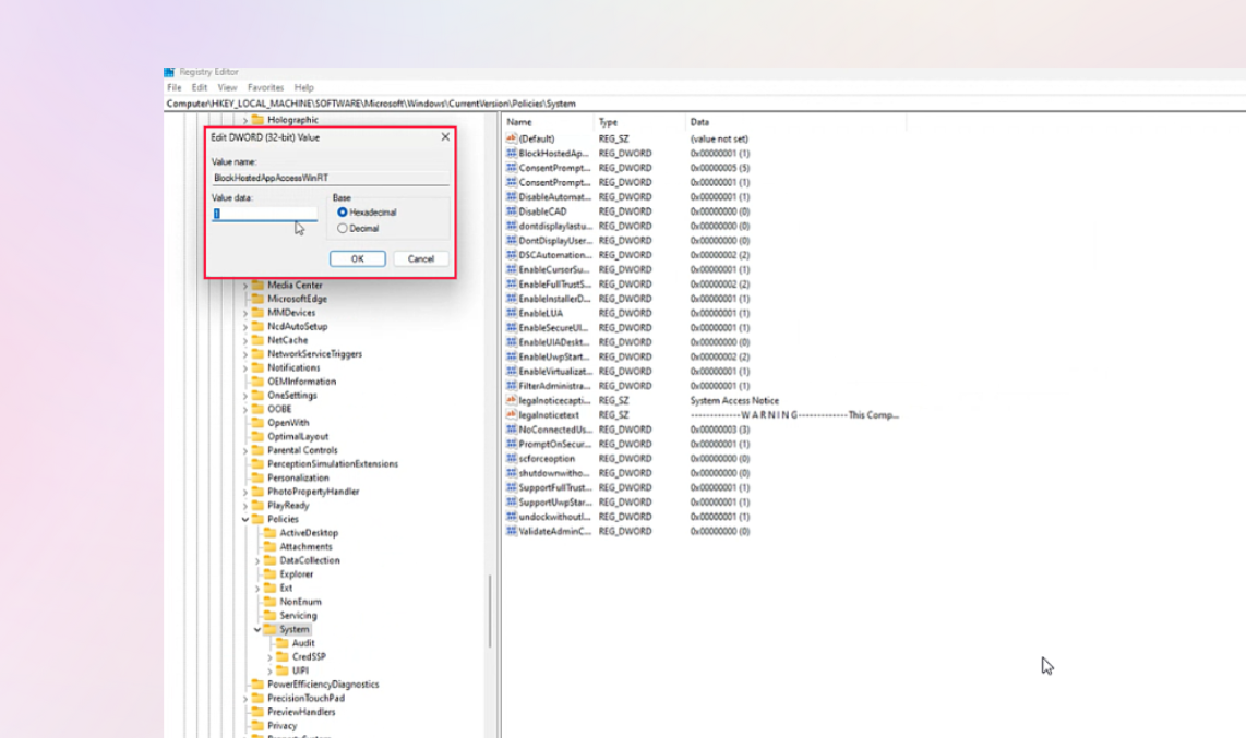 In System, open the BlockHostedAppAccessWinRT registry file and change value data to 0. By default, the value will be 1.