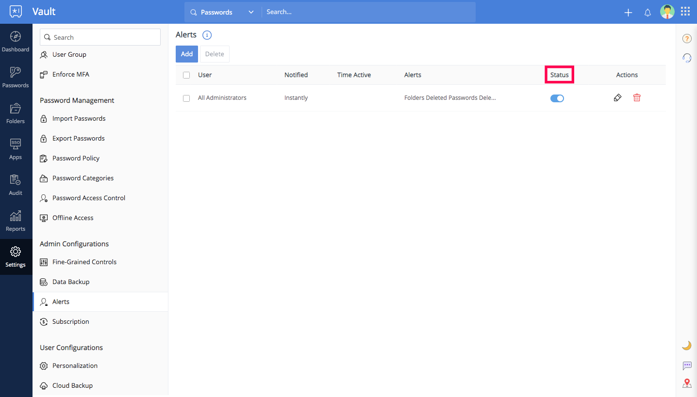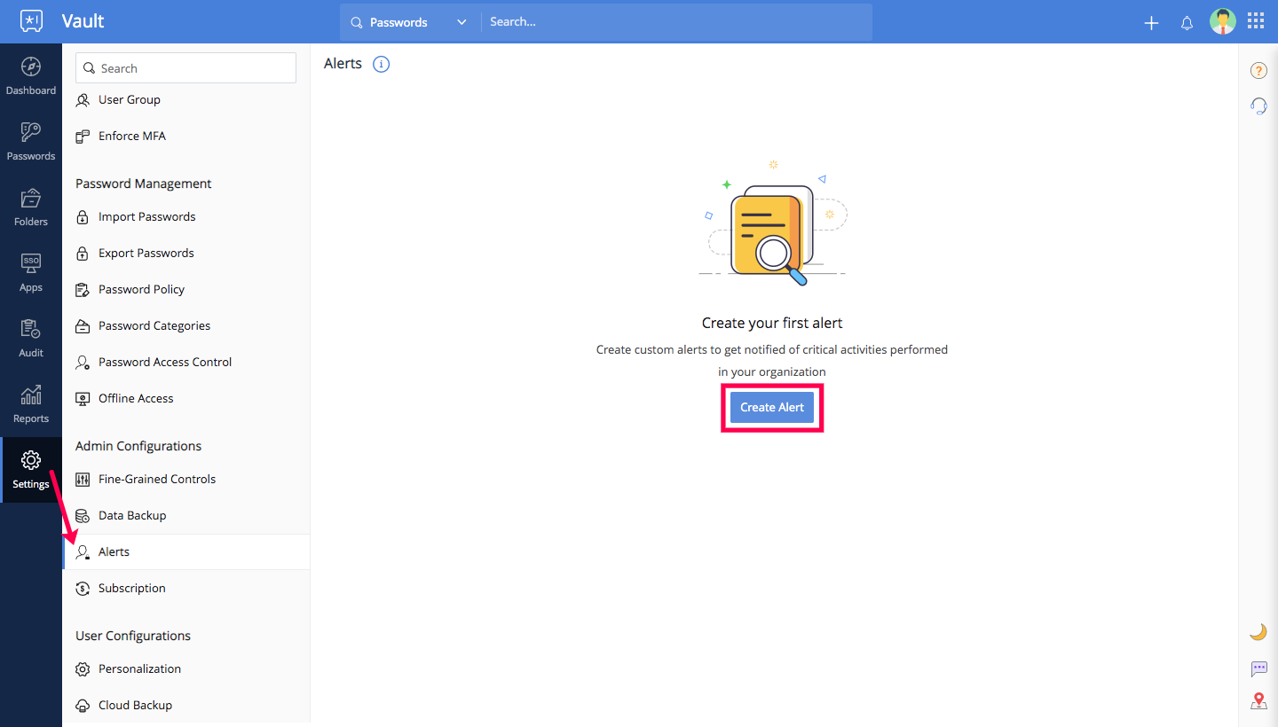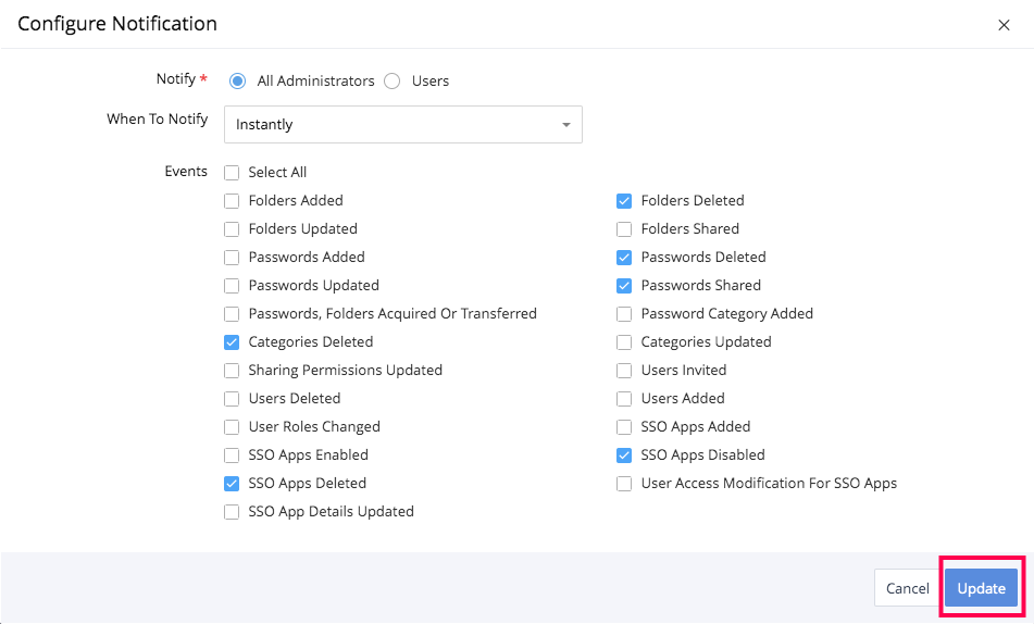 Get alerted instantly when critical events occur in your Zoho Vault account. Select the events important to you and configure alerts to receive instant or periodic notifications via email. These alerts can only be configured by a super-admin of the organization.