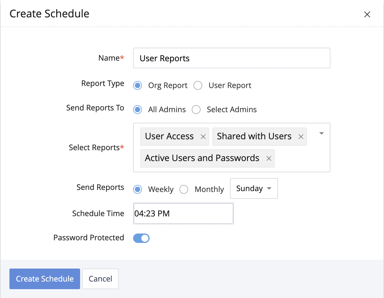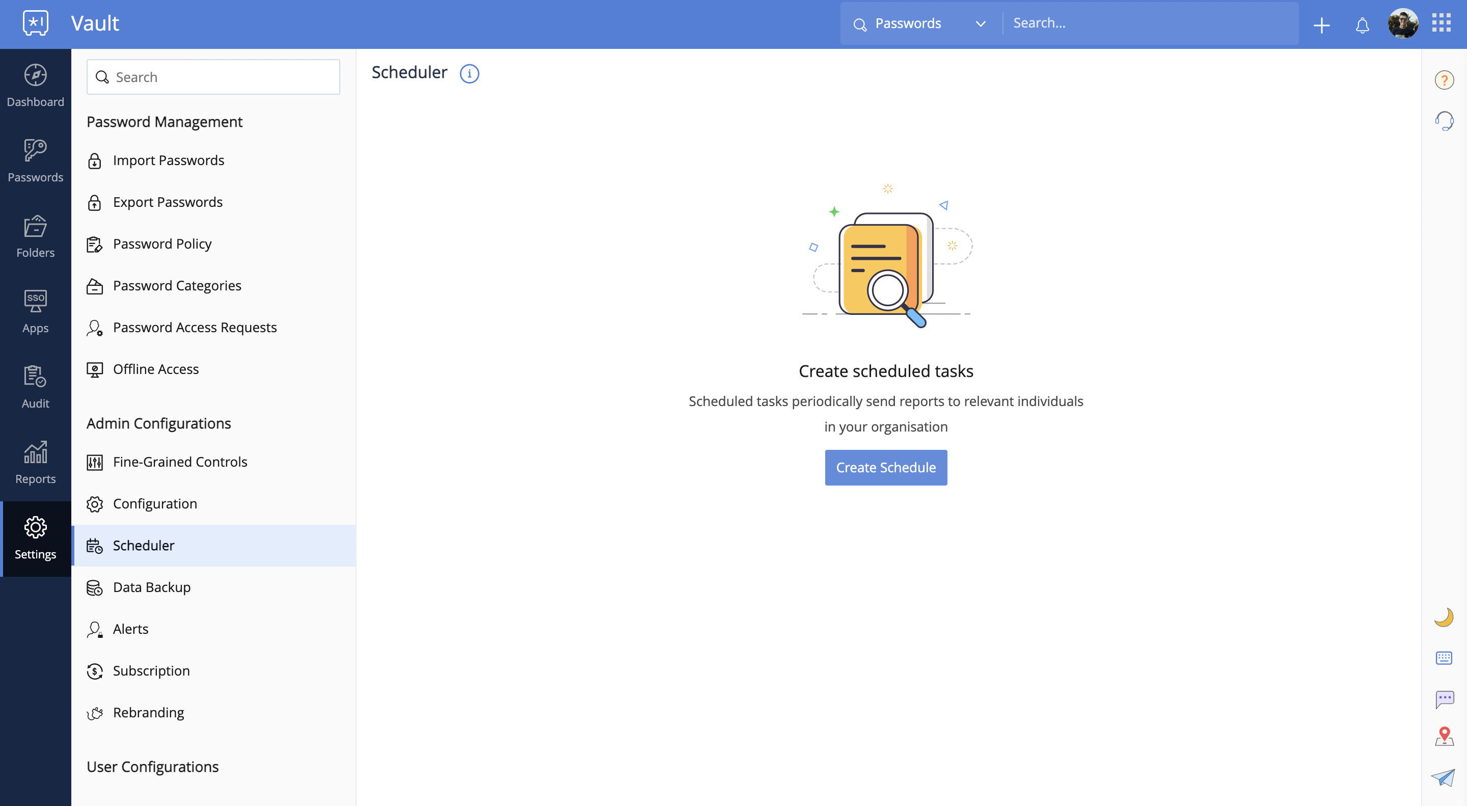 When using a password manager, it's important to regularly audit user activity to monitor and eliminate threats. To make auditing simpler, Zoho Vault offers automated schedulers for frequently monitored reports. Using the Scheduler feature, admins and users can receive copies of relevant reports to their registered email addresses on their preferred weekly or monthly basis.
