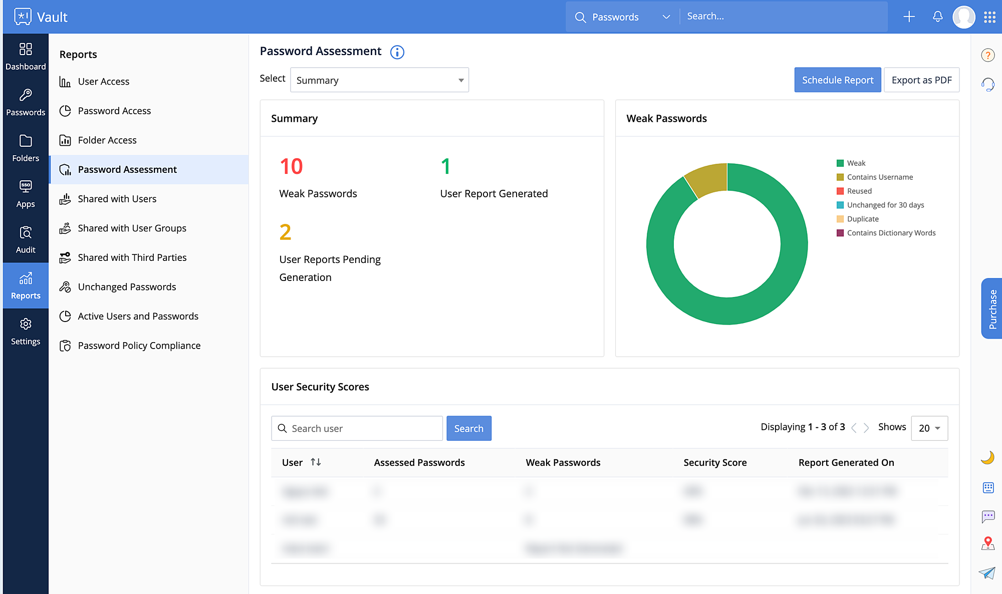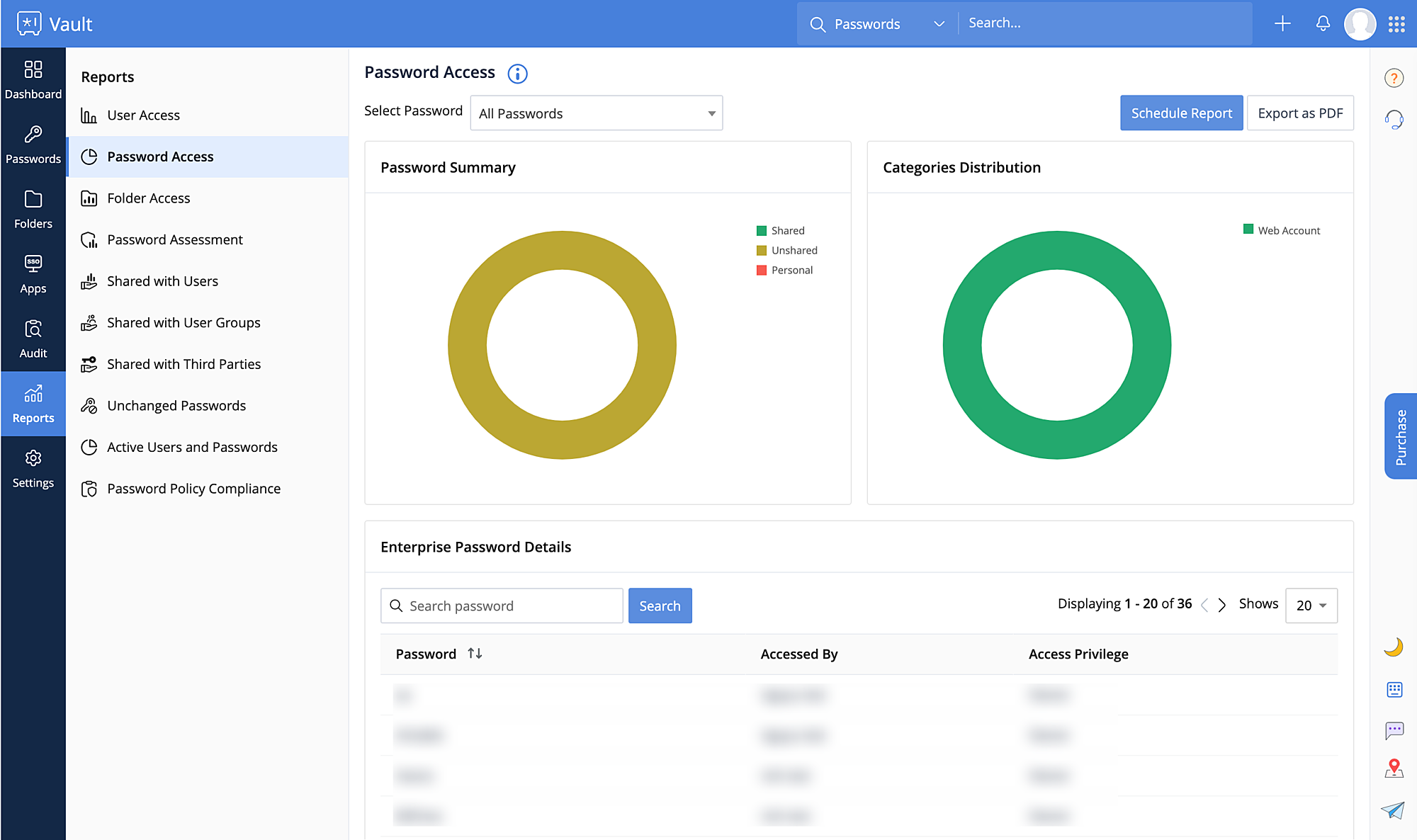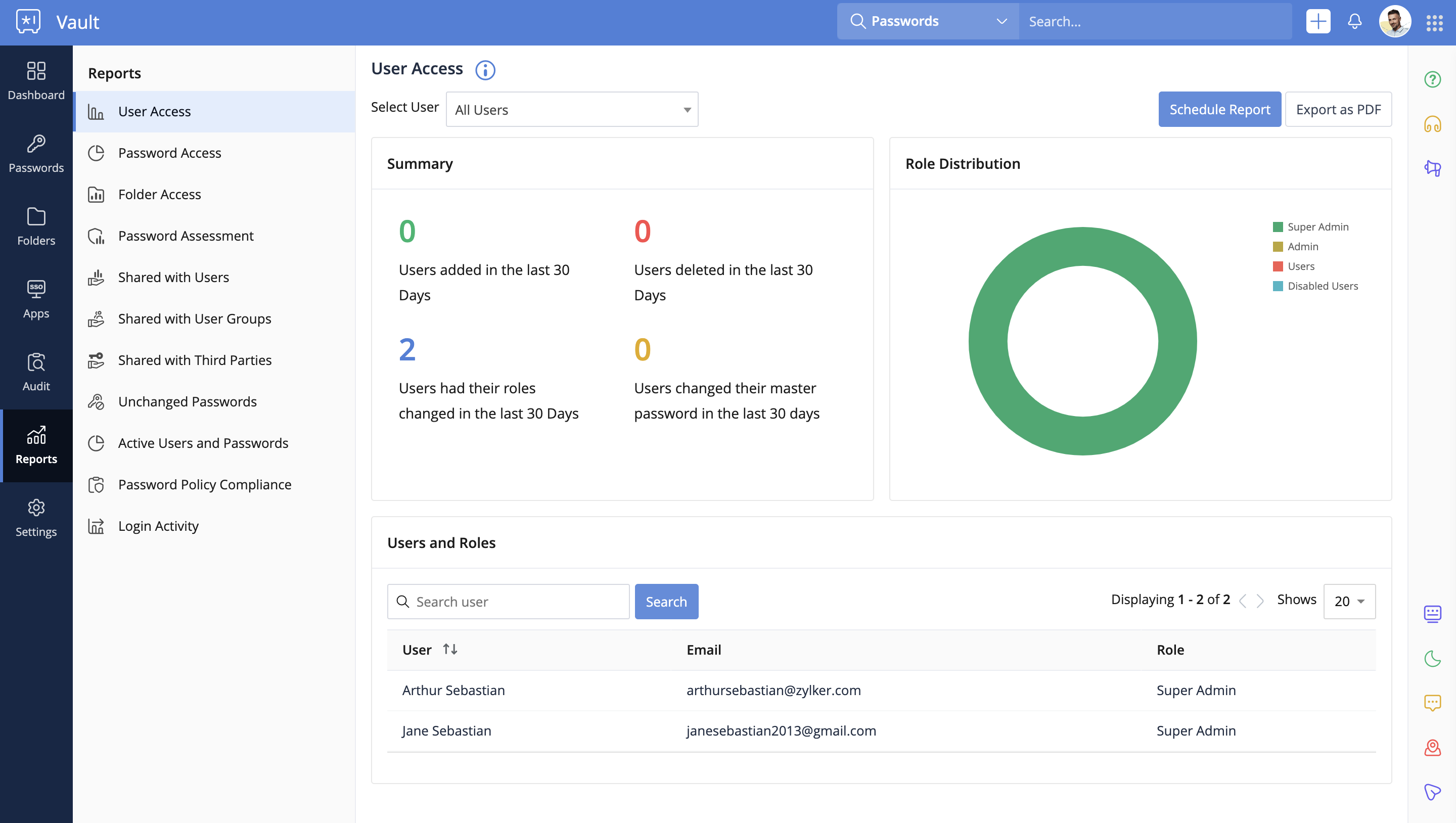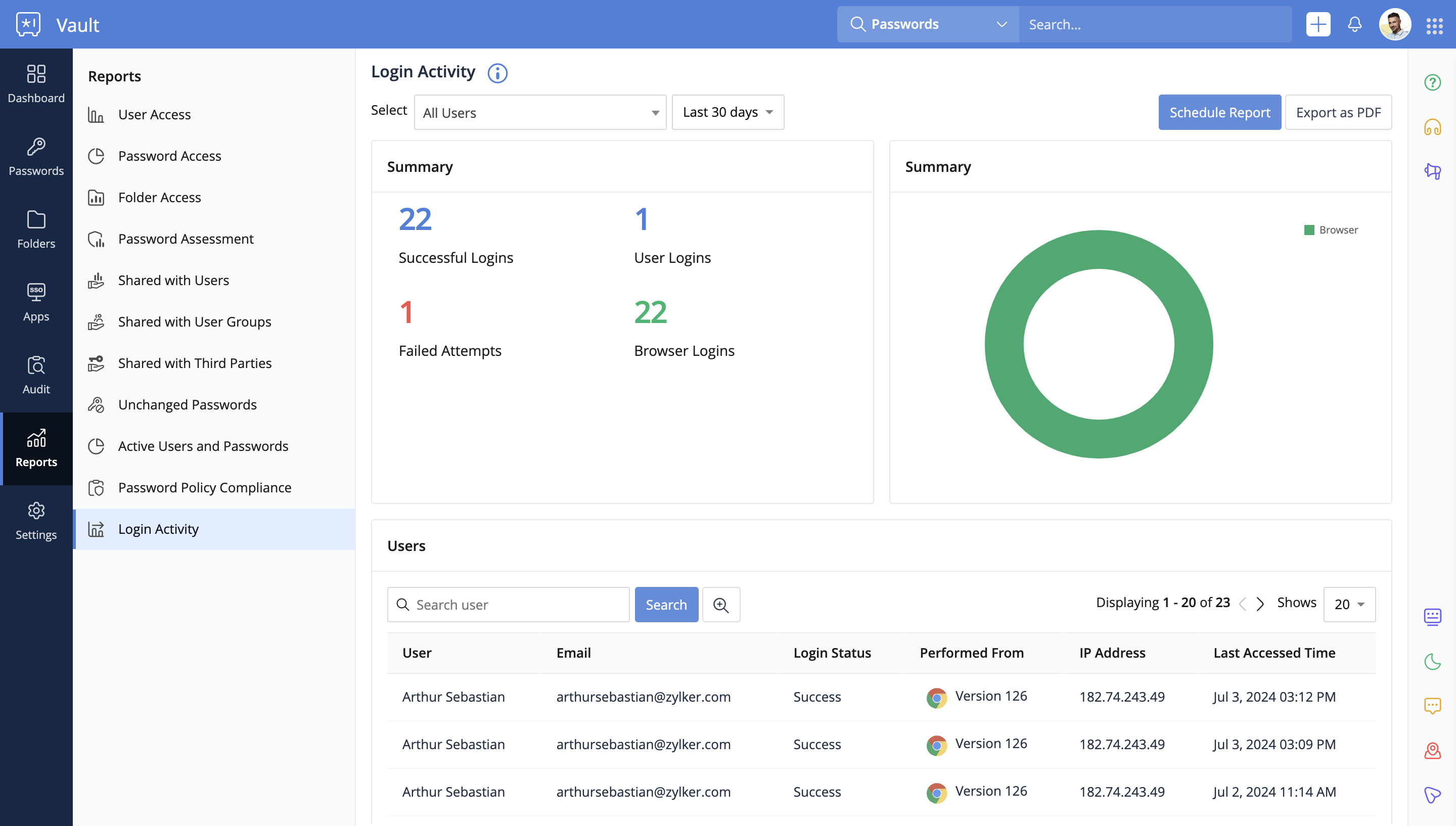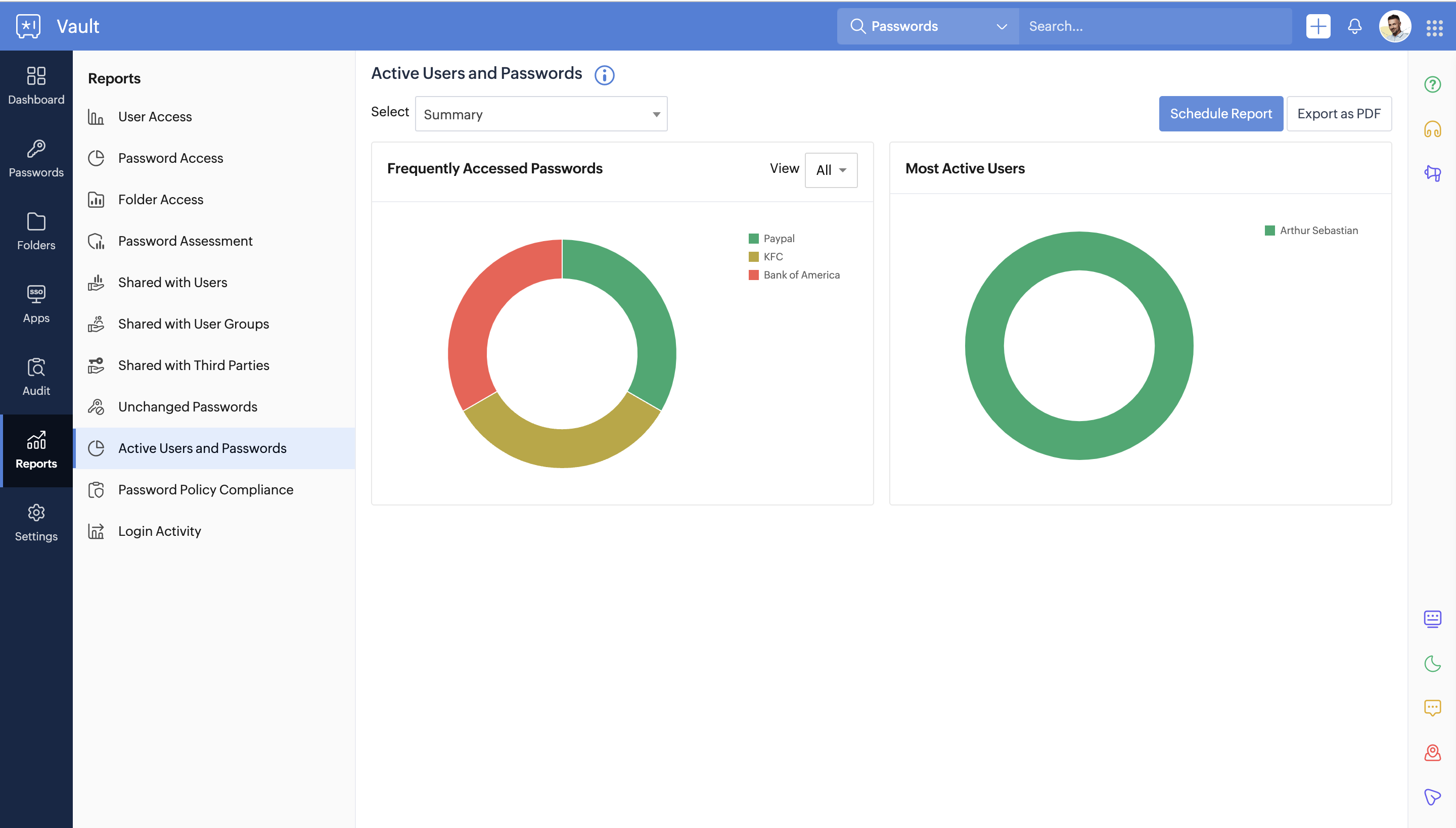 If you're an administrator making business-critical decisions, you require complete visibility to manage your enterprise passwords. Zoho Vault provides intuitive reports in simple tables and graphs that display an overview of various activities carried out in your organization's Vault. Super-admins and administrators have access to these reports, to monitor and implement necessary steps to stay compliant. You can access nine different reports from the Reports tab, as well as export them as PDFs, which can be used for internal auditing.