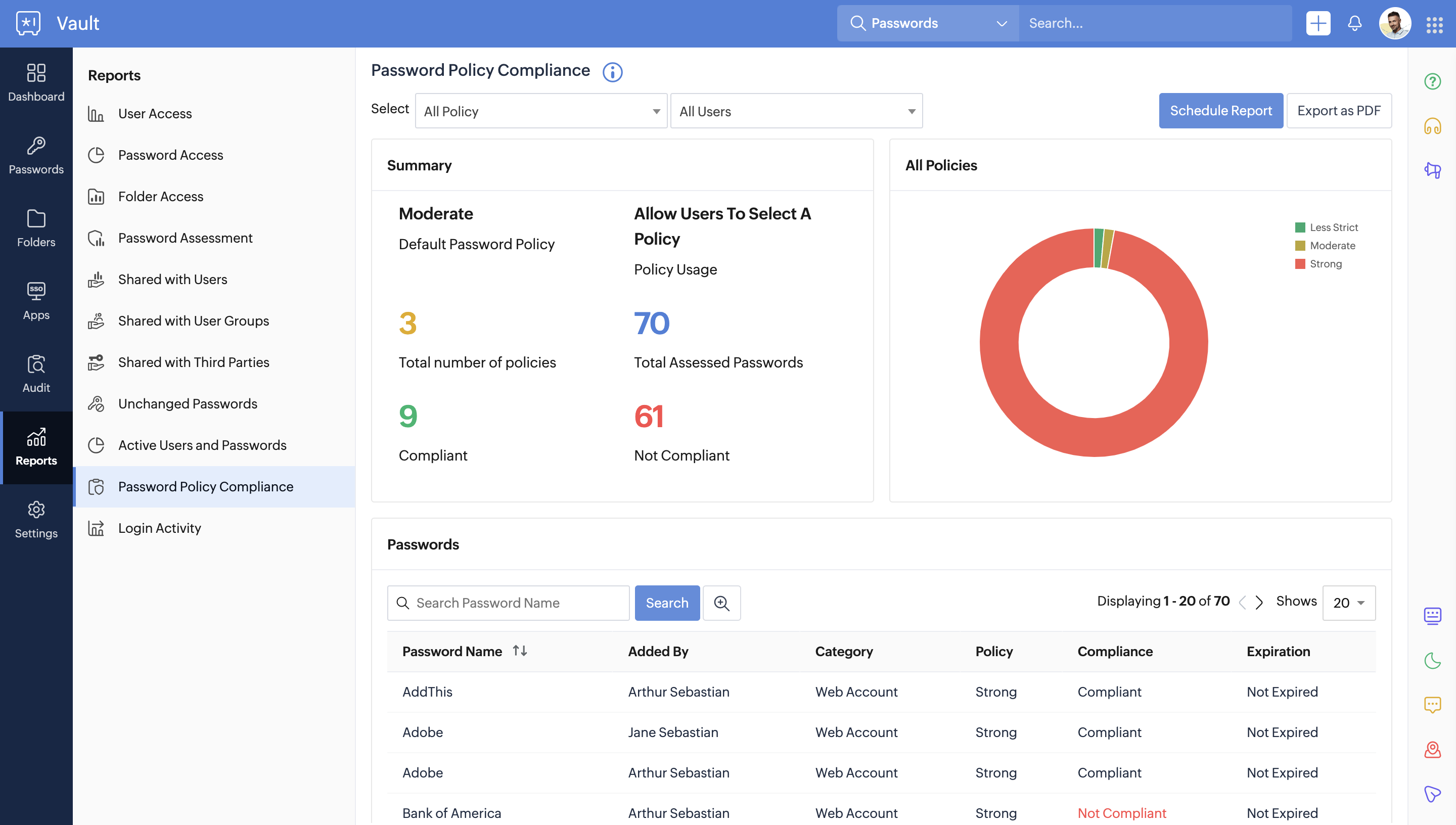 Identify whether passwords stored in your account are compliant with the default policy or other custom policies. Additionally, administrators can also verify compliance of users to policies by selecting the appropriate options.