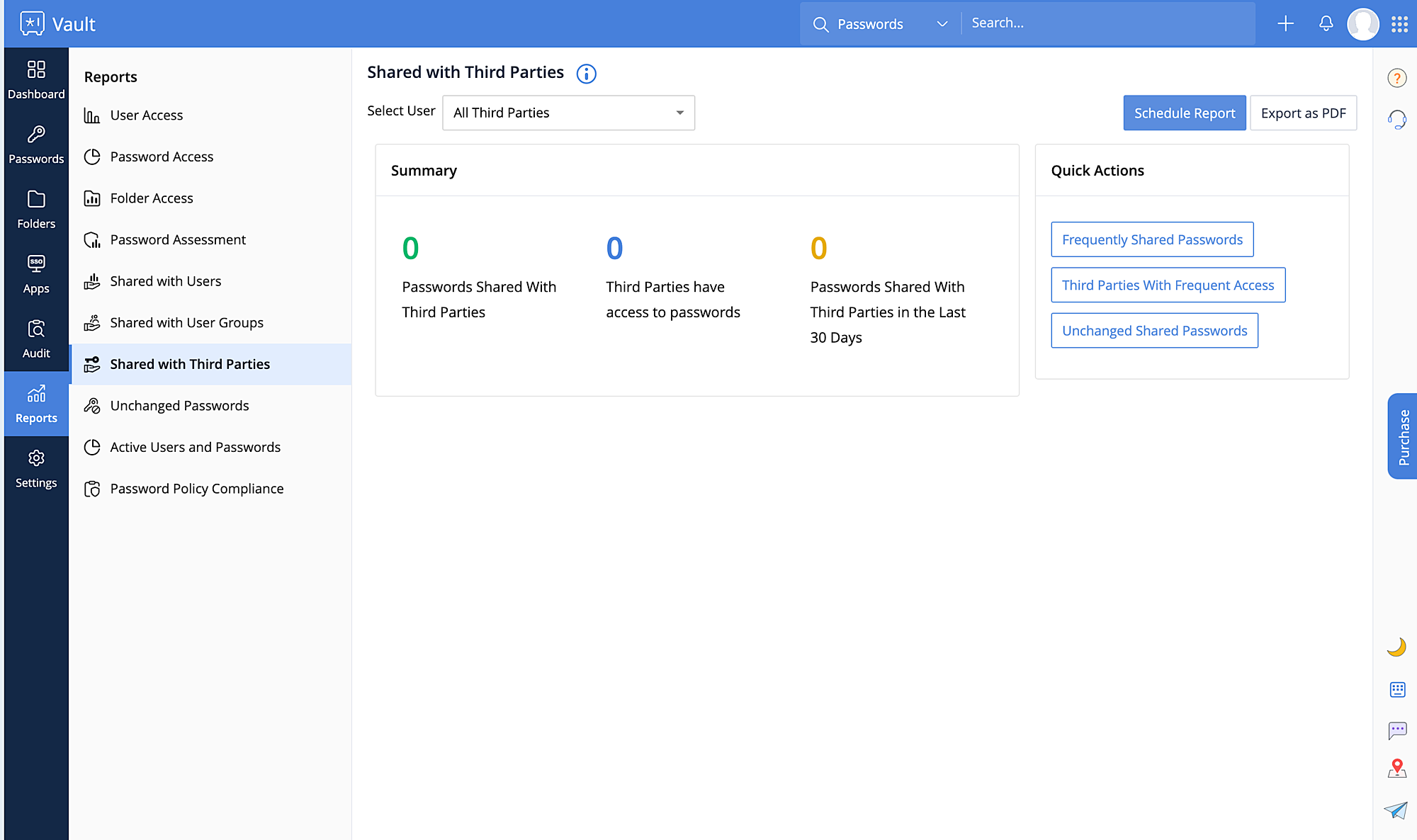 You can share passwords with individuals, teams, and trusted third parties, such as contractors and freelancers using Zoho Vault. We have dedicated reports detailing each action in detail. This will help you precisely monitor your users' sharing behavior.