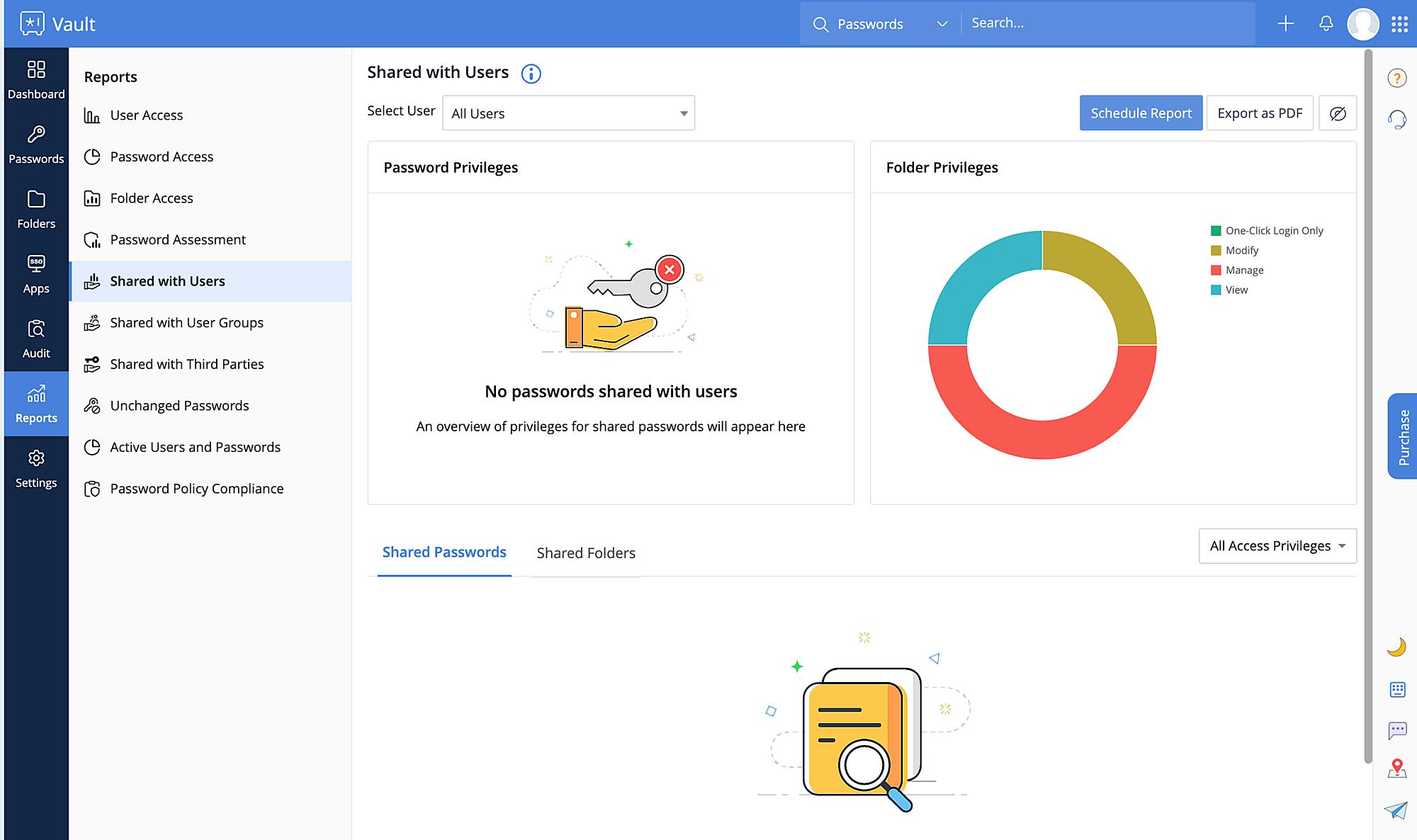View reports that detail all the passwords and folders that have been shared with different access privileges for different users. Select All users to get an overview of all shared passwords and folders, or select a particular password to view its sharing details.