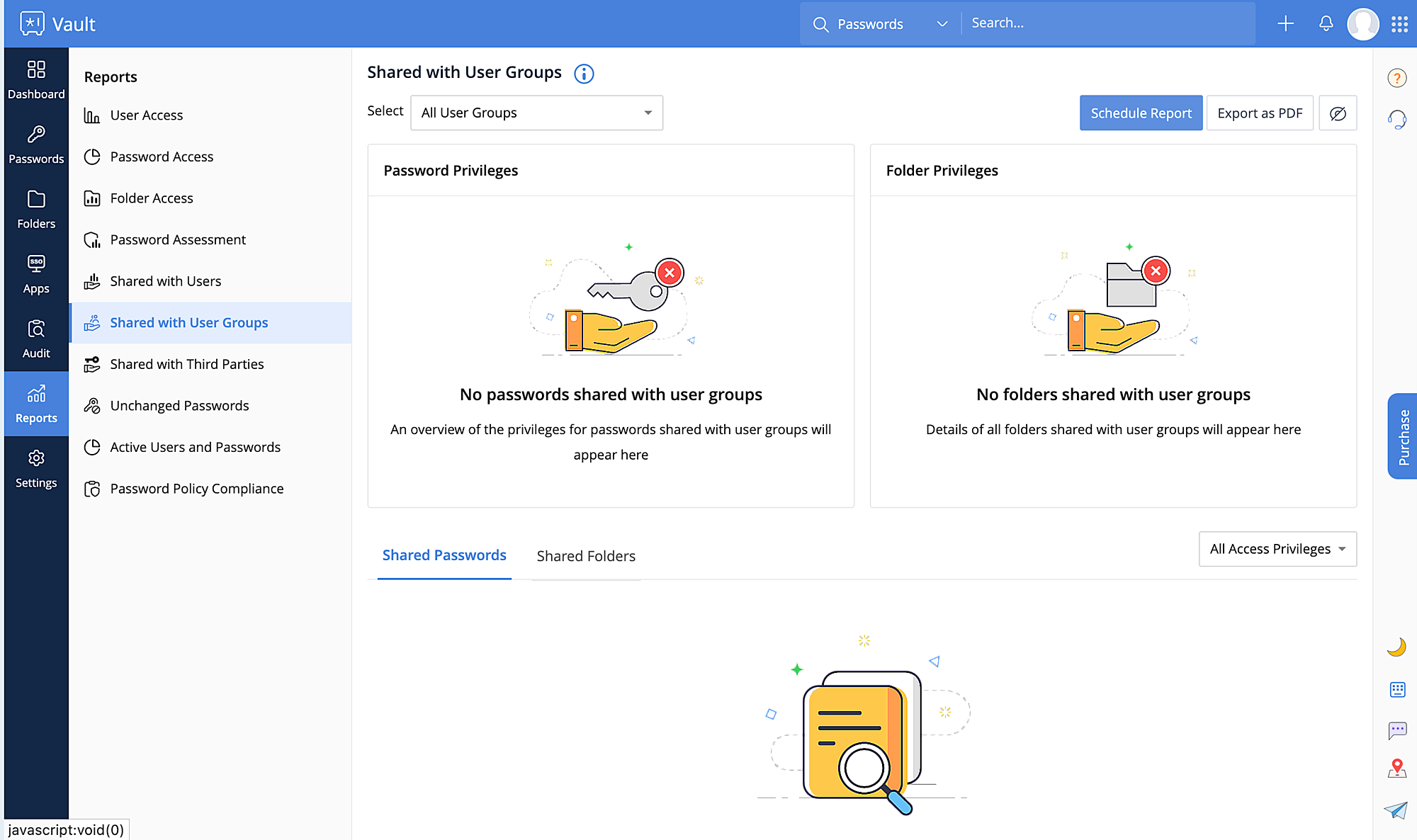 This report displays the list of passwords and folders that have been shared with different user groups, along with their access privileges. You can view the sharing status of all groups, as well as that of a particular group, by selecting one from the dropdown.