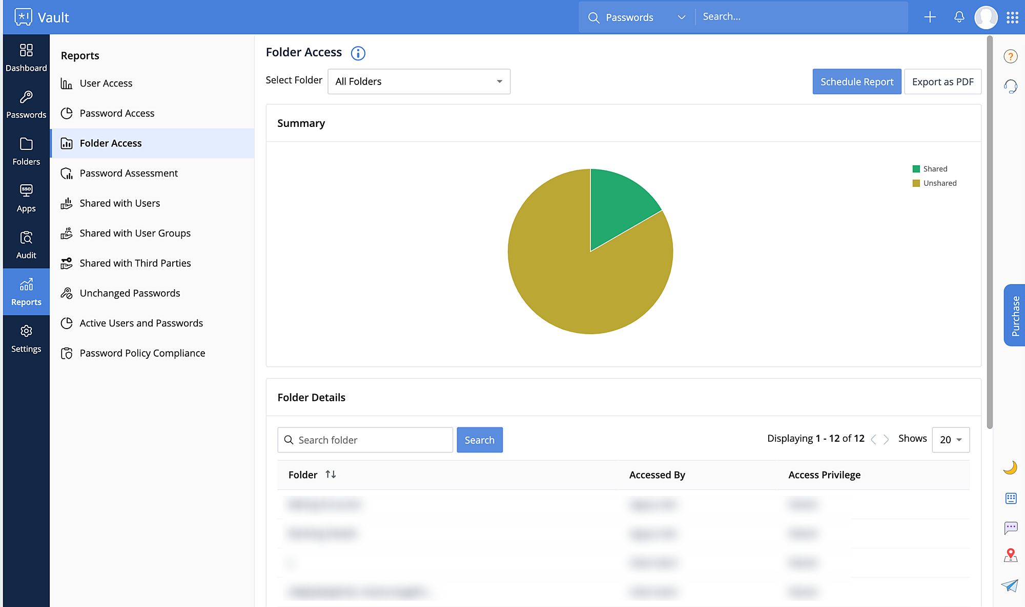 Get an overview of the sharing status and owner details of all folders. Select individual folders to view the associated passwords along with additional details of the passwords.