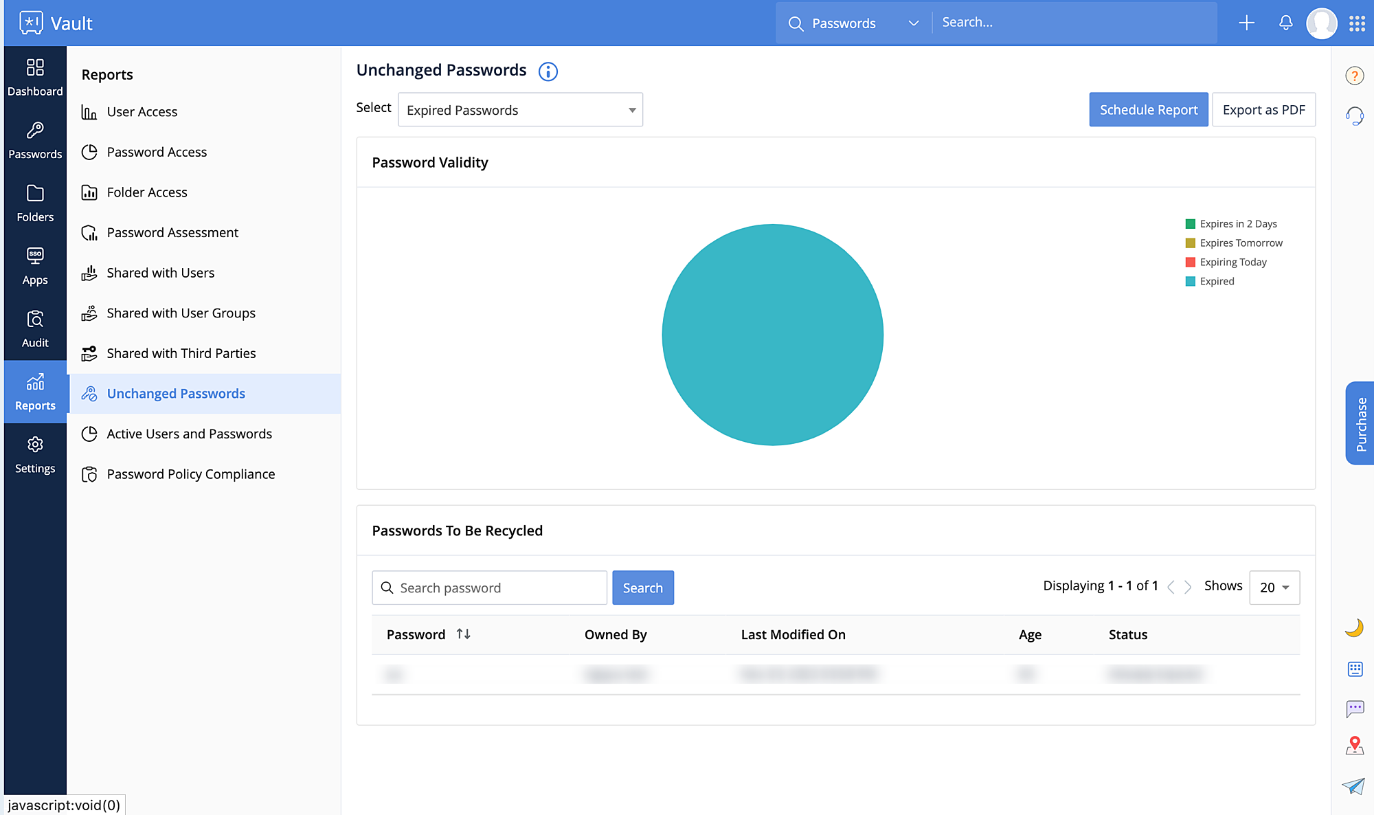 By default, the validity of every password is sixty days in the password policy. This can be modified according to your security policies. Passwords that remain unchanged beyond this period are classified as expired. Expired passwords will remain intact in Zoho Vault, even if you refrain from changing them.