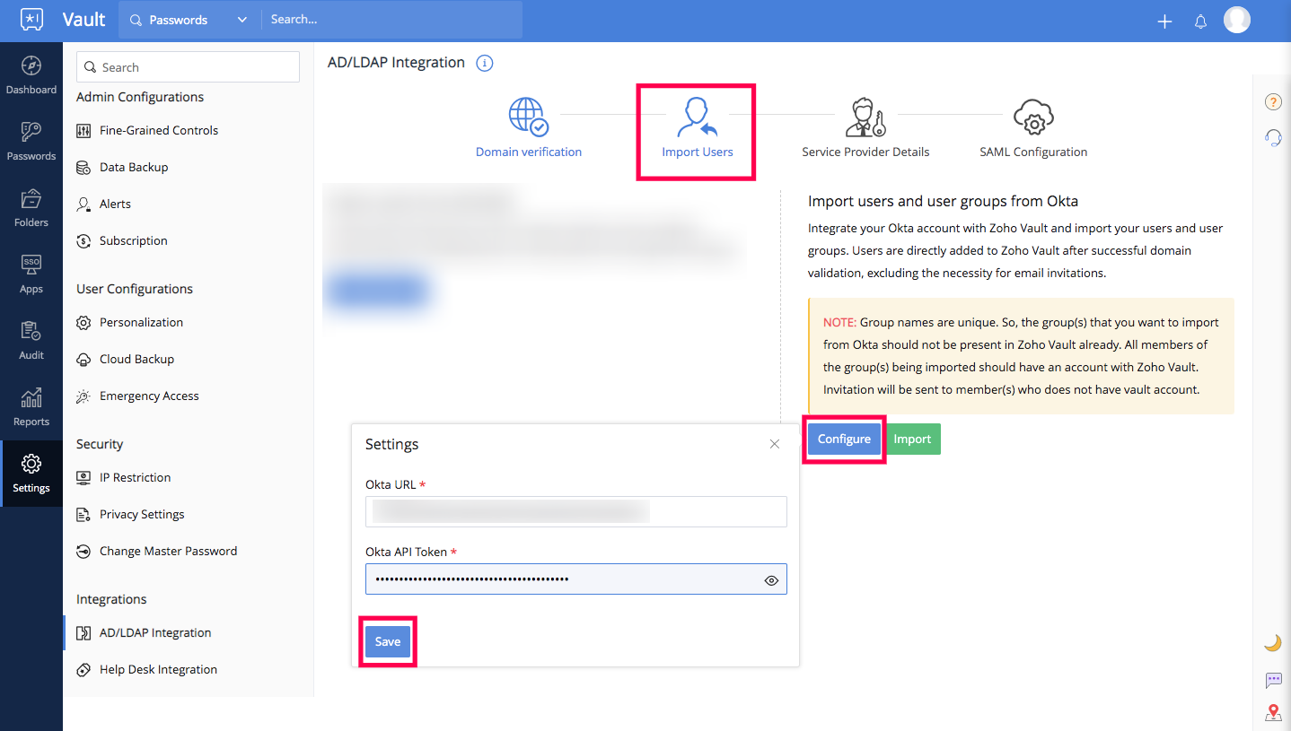 Zoho Vault allows admins to import multiple users and user groups from a federated single sign-on solution like Okta. Enterprises can now onboard their entire team or selective users from Okta in no time. This configuration involves two steps: