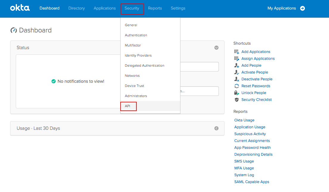 Follow the steps mentioned below to generate an API token from Okta to update in Zoho Vault.