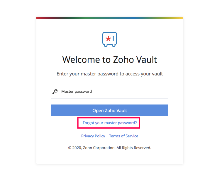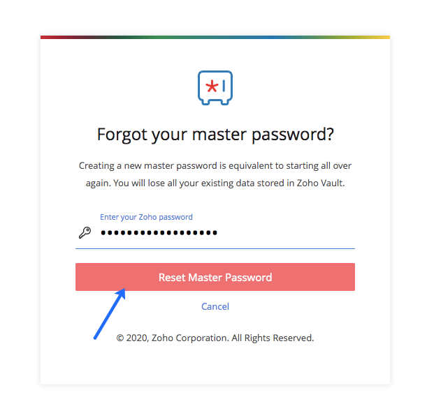 Zoho Vault encrypts all your data with your master password, which means we do not store it anywhere on our servers. If you forget your master password, we'll be unable to recover it for you. When you reset it, you'll lose access to all your personal passwords. To reset your master password: