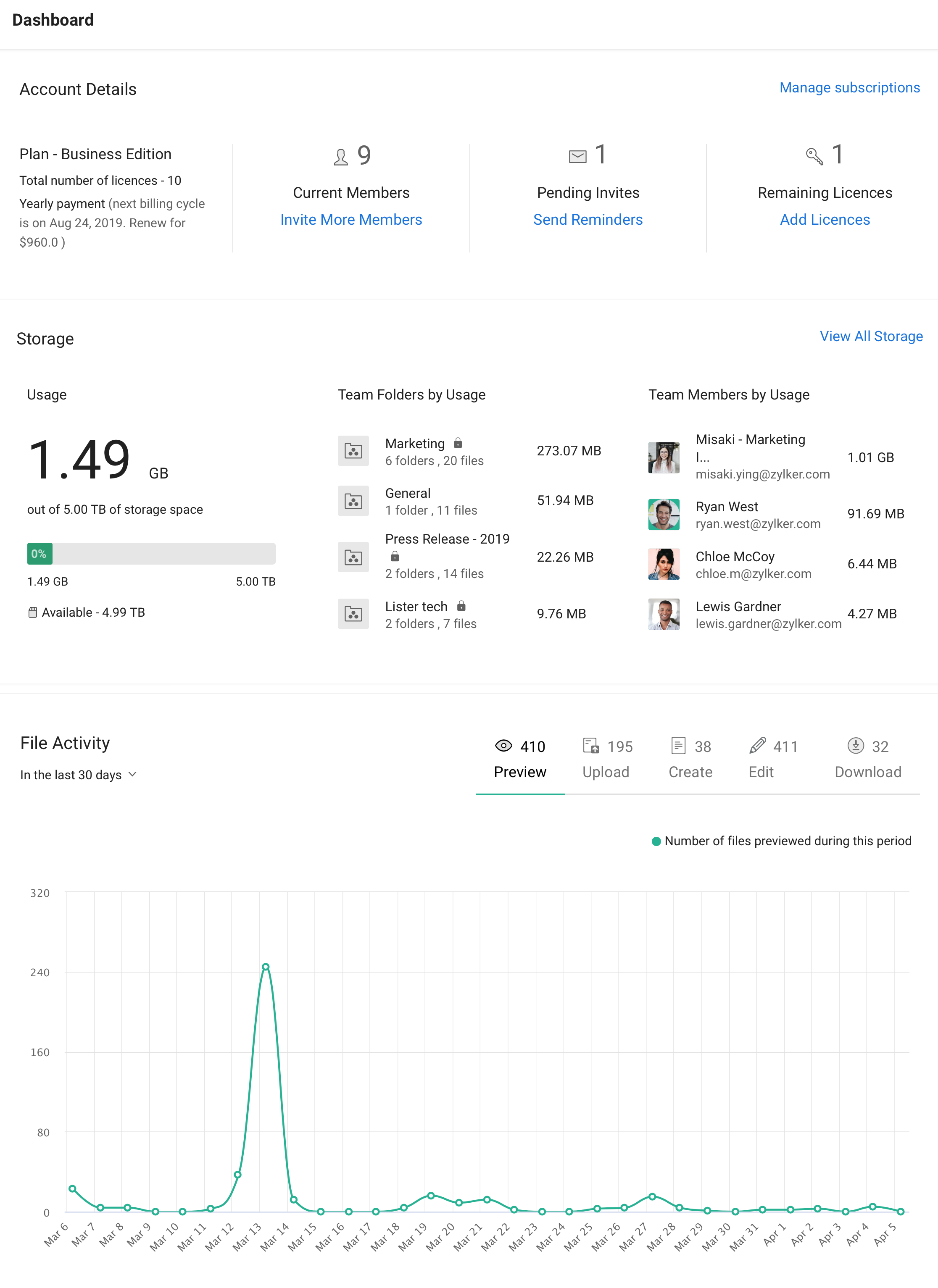 3. Switch between the titles at the top-right corner to view activity graphs for file additions, previews, edits, uploads, and downloads.