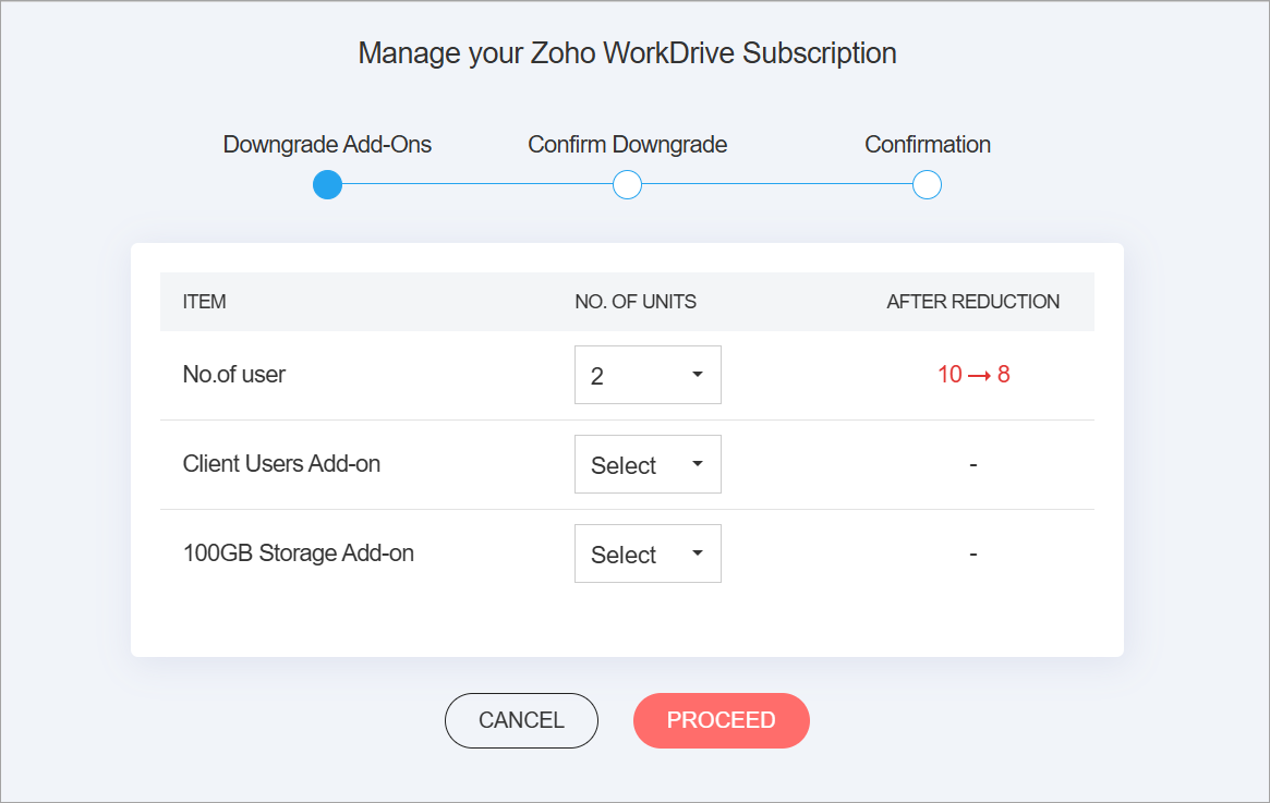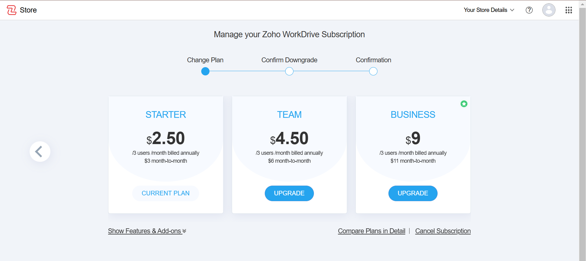 4. You can either upgrade to a higher plan or downgrade to a lower plan of WorkDrive.