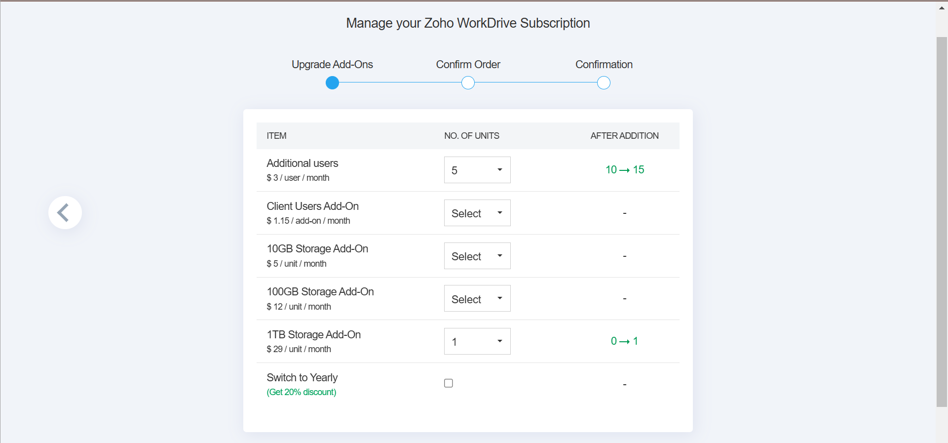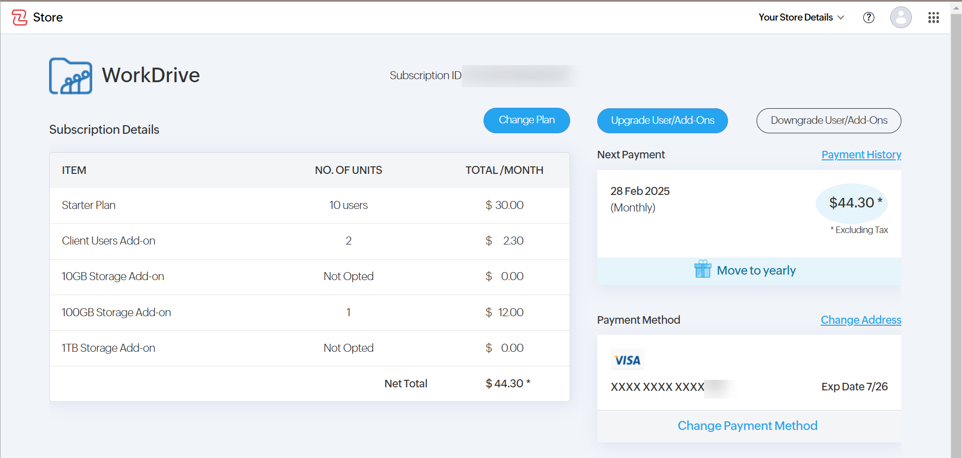 Items purchased (WorkDrive plan, Client user add-ons, Storage add-ons)