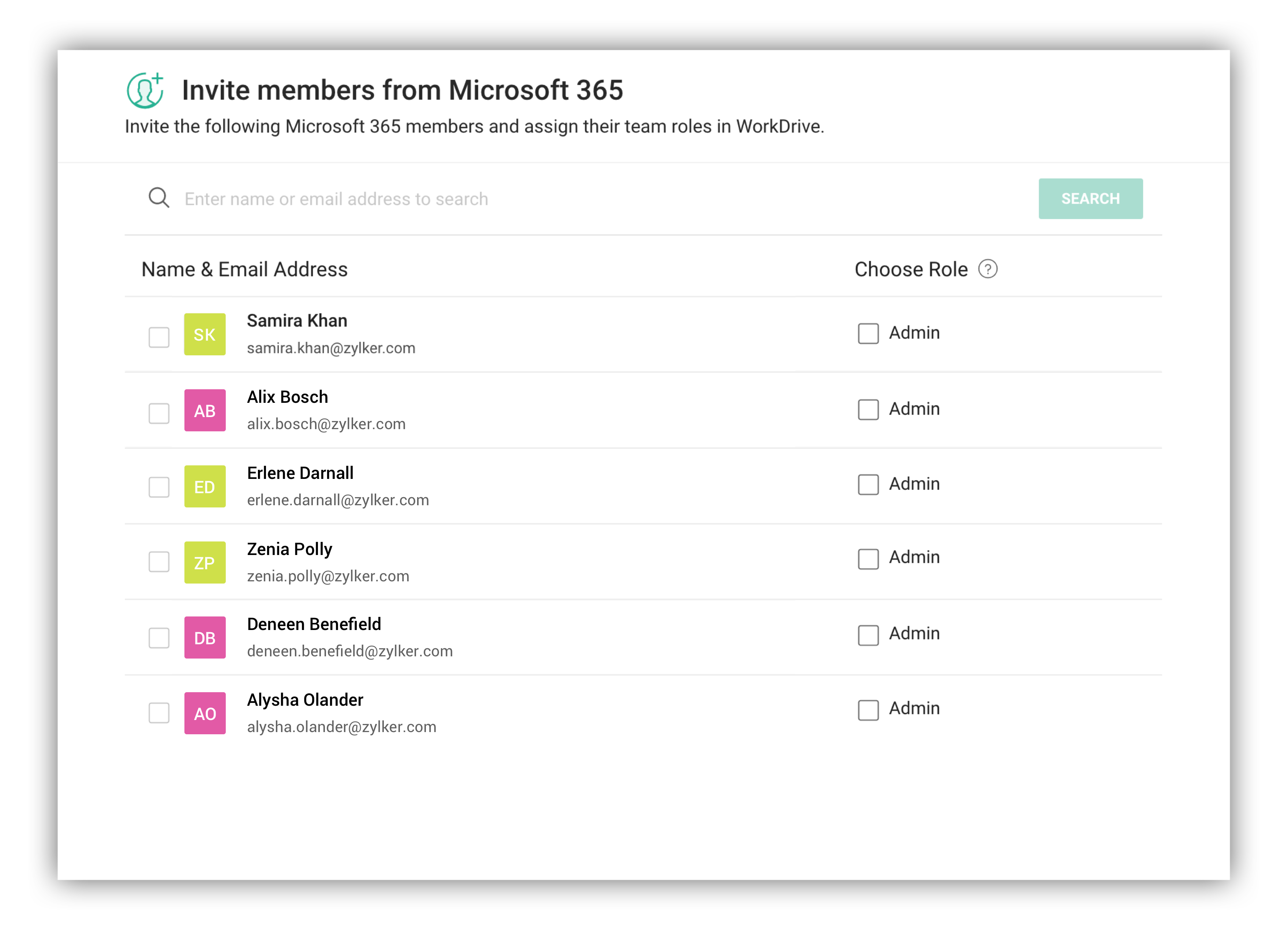 9. Selecting "Admin" in the checkbox to the right of the user's name will add them as a Team Admin in WorkDrive. If not checked, they will be added as a Team Member.