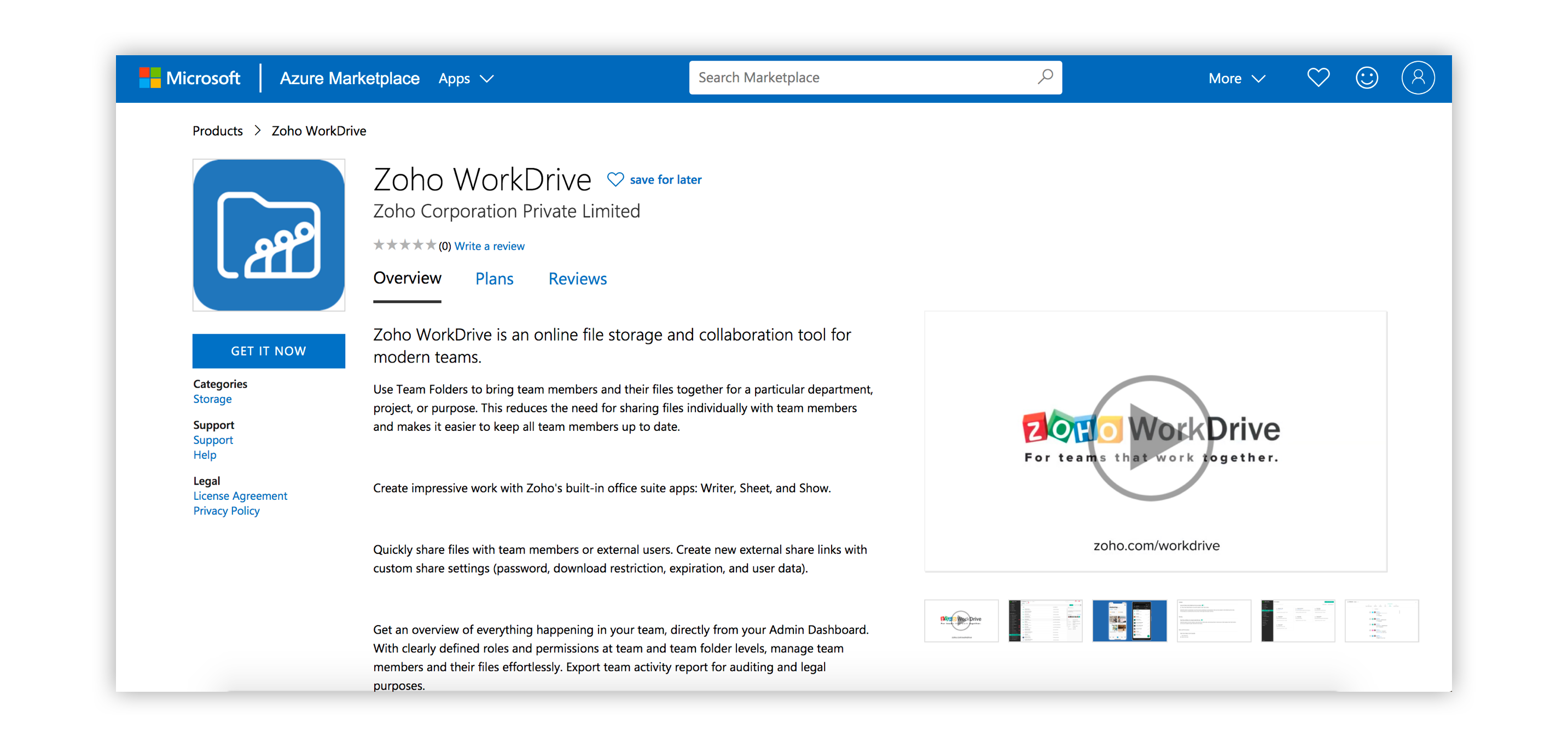 2. Go to the WorkDrive app page in Microsoft Azure Marketplace or Microsoft AppSource.