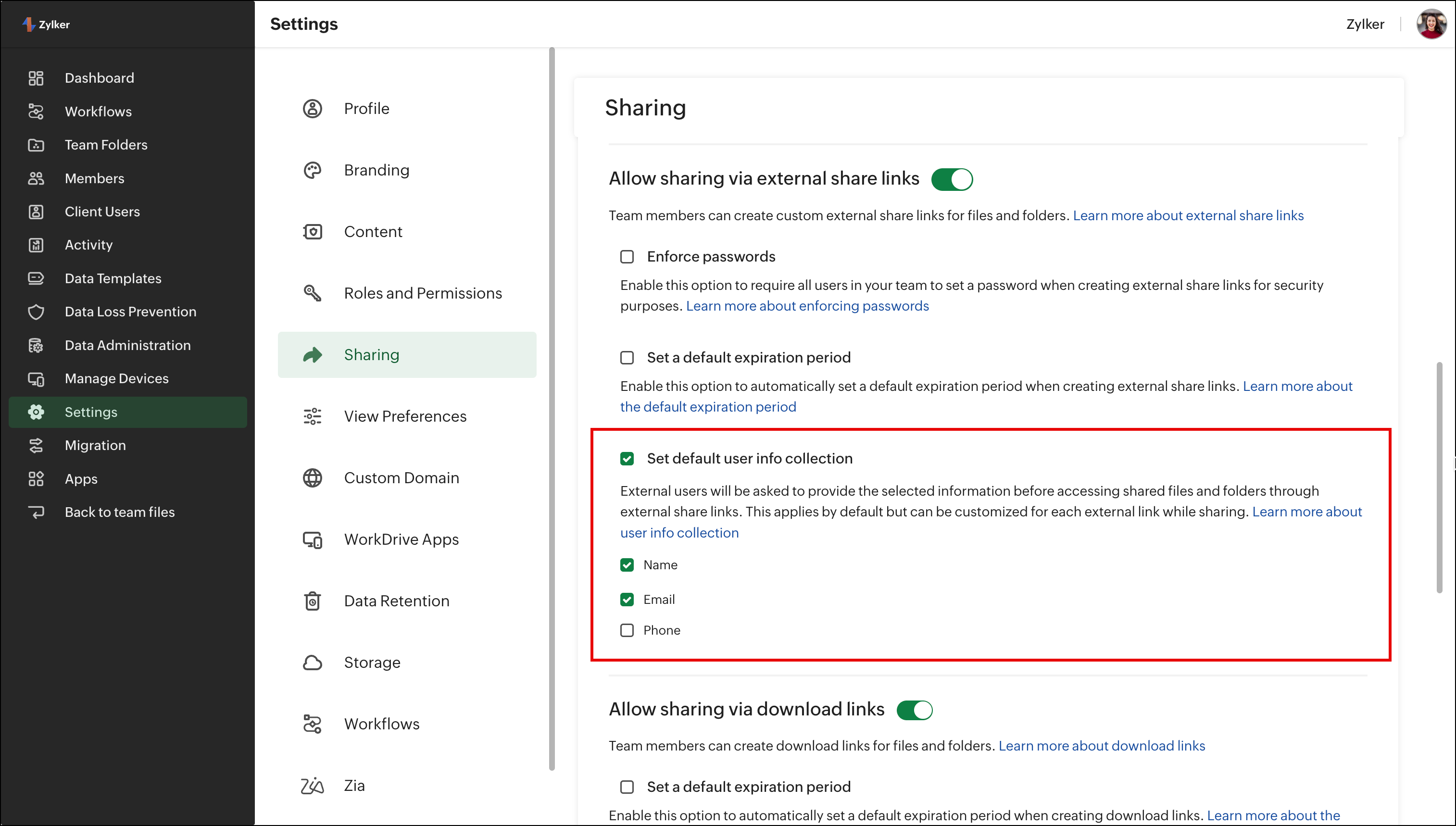 - Download links: Allow or restrict your team members to create download links for the files and folders.