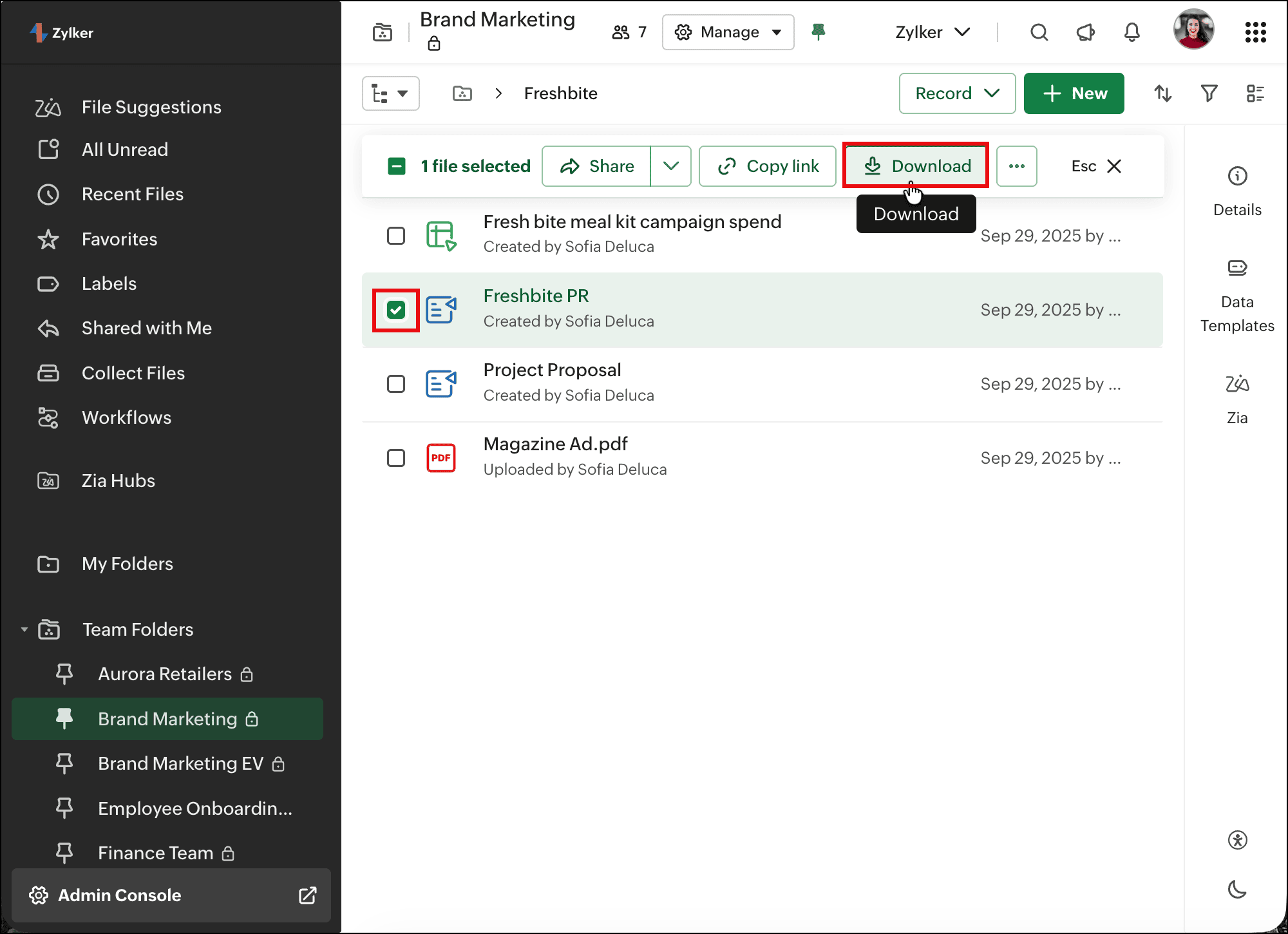 Quickly preview files to check their content before downloading, and download files or folders to your system whenever you need offline access. This helps you save time, avoid unnecessary downloads, and keep your work moving without switching tools.