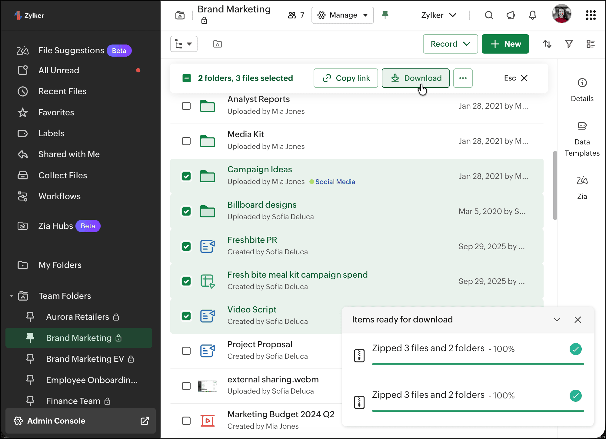 The selected files and/or folders will be zipped into a folder named Zoho WorkDrive and downloaded to your system. You can change the zip name while saving, if needed.