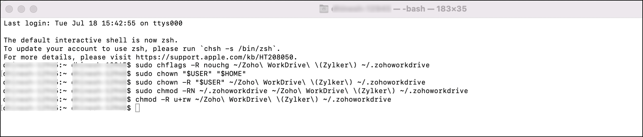 sudo chmod -RN ~/.zohoworkdrive ~/Zoho\ WorkDrive\ \(<Team Name>\)