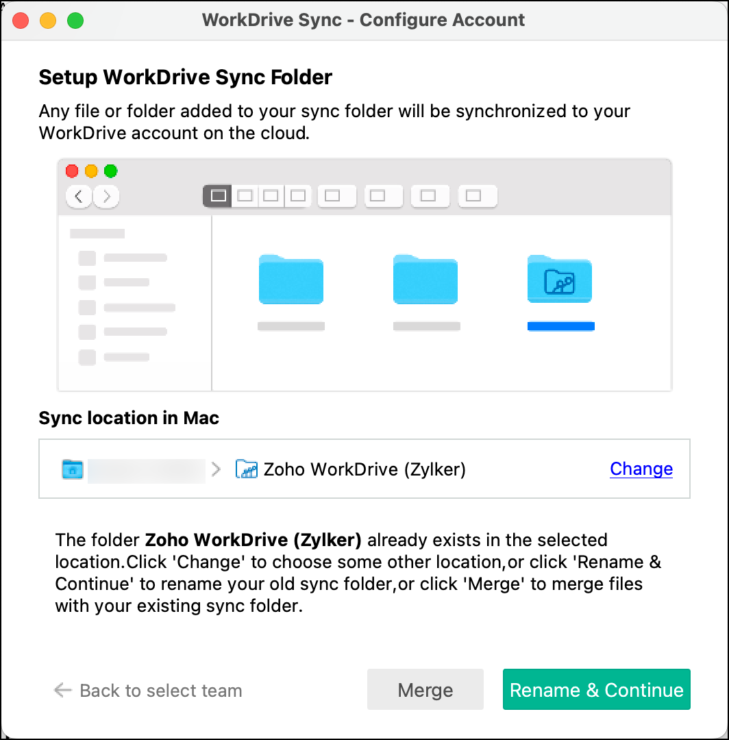 For every subsequent reinstallation on that device, the sync will try to create a new sync folder in the same location. If there's an existing folder with the same name [Zoho WorkDrive (Team Name)], you will have the following three options.