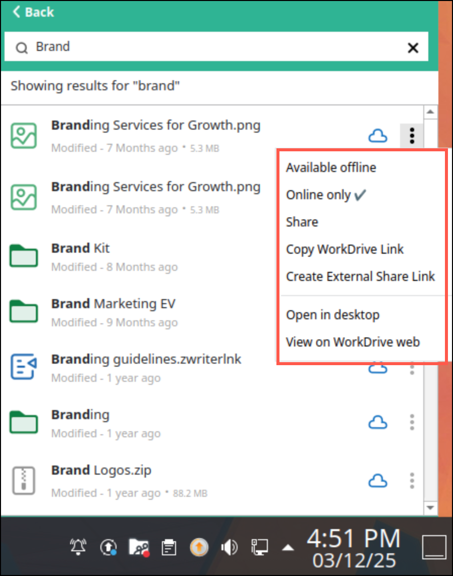 Context menu helps you to efficiently manage your stored files or folders in WorkDrive TrueSync application. Simply click on the More actions icon in the in-app search to view the list of options below: