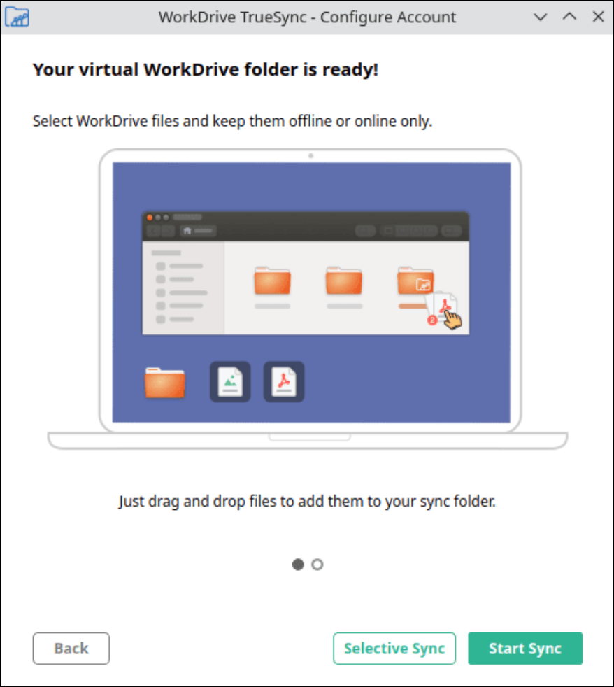 WorkDrive TrueSync for Linux lets you access all your WorkDrive files from your desktop without using local storage. Files are stored in the cloud and streamed to your system on demand, with the ability to mark specific items for offline access.