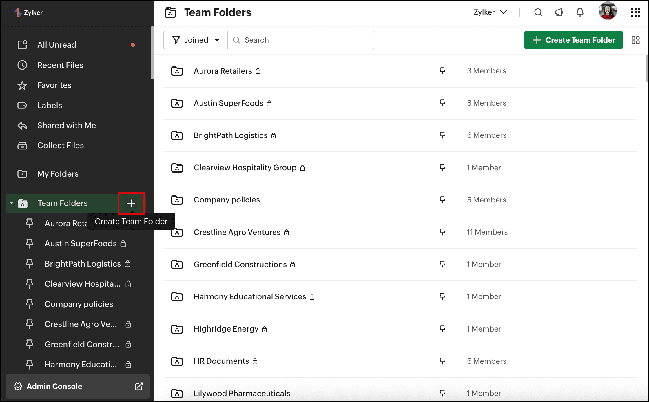 You can create multiple Team Folders and add members to each one based on your team’s structure, projects, or responsibilities. For example, you might have Team Folders such as Project Brazil, Marketing Assets, and HR Documents, and include only the relevant members in each Team Folder for controlled access.