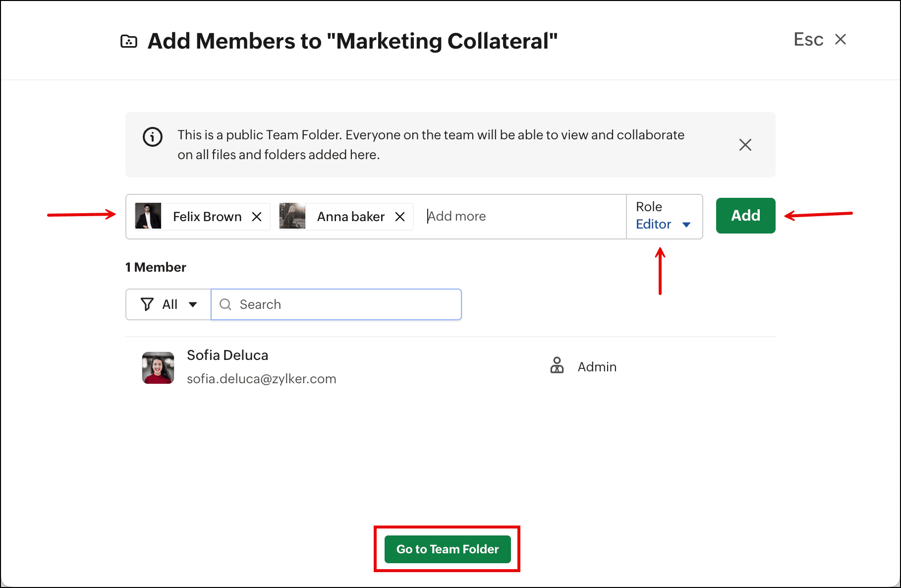 To add members, enter their email addresses, assign roles, and click Add and click Go to Team Folder.