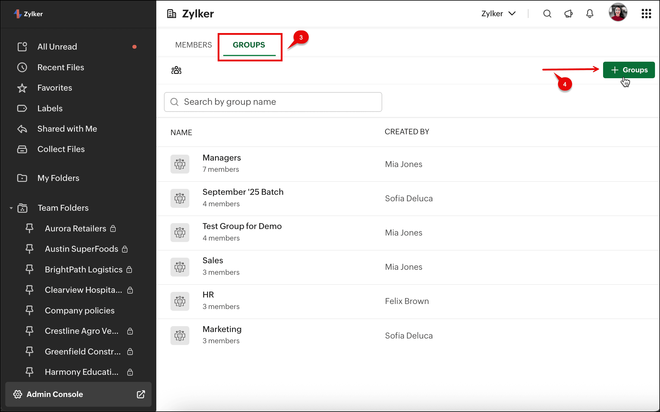 Groups created within the WorkDrive app are said to be WorkDrive Groups. These Groups can't be used in other Zoho apps.