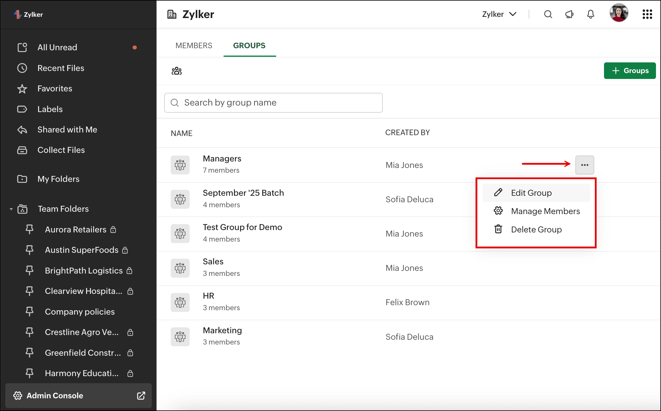 You can create Groups based on member roles or profiles, and add them to Team Folders to simplify collaboration.